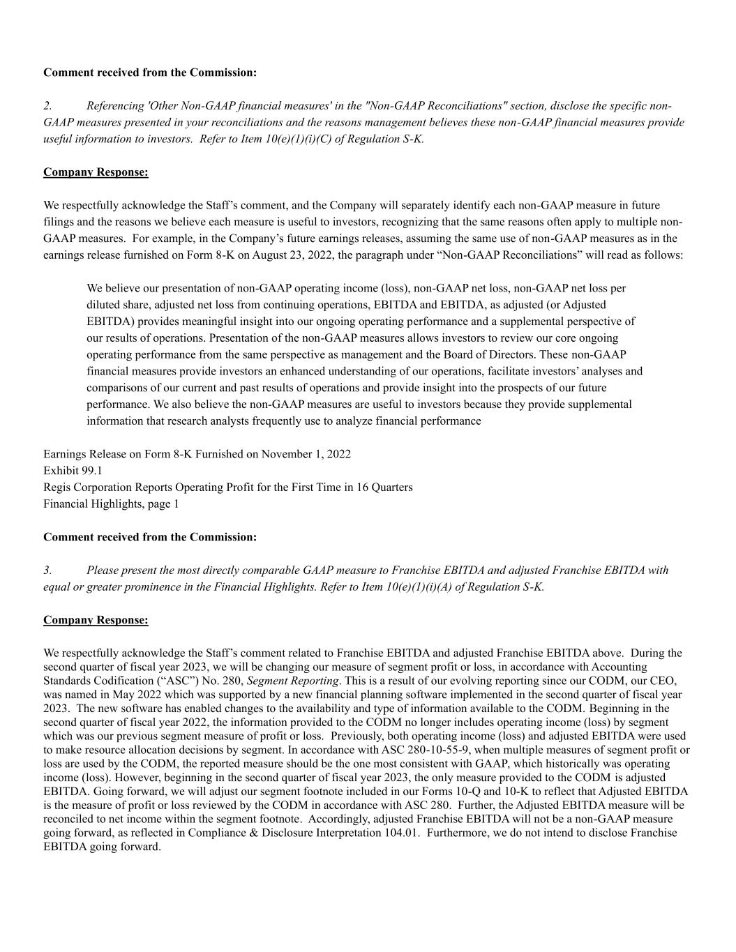 Comment received from the Commission: 2. Referencing 'Other Non-GAAP financial measures' in the "Non-GAAP Reconciliations" section, disclose the specific non- GAAP measures presented in your reconciliations and the reasons management believes these non-GAAP financial measures provide useful information to investors. Refer to Item 10(e)(1)(i)(C) of Regulation S-K. Company Response: We respectfully acknowledge the Staff’s comment, and the Company will separately identify each non-GAAP measure in future filings and the reasons we believe each measure is useful to investors, recognizing that the same reasons often apply to multiple non- GAAP measures. For example, in the Company’s future earnings releases, assuming the same use of non-GAAP measures as in the earnings release furnished on Form 8-K on August 23, 2022, the paragraph under “Non-GAAP Reconciliations” will read as follows: We believe our presentation of non-GAAP operating income (loss), non-GAAP net loss, non-GAAP net loss per diluted share, adjusted net loss from continuing operations, EBITDA and EBITDA, as adjusted (or Adjusted EBITDA) provides meaningful insight into our ongoing operating performance and a supplemental perspective of our results of operations. Presentation of the non-GAAP measures allows investors to review our core ongoing operating performance from the same perspective as management and the Board of Directors. These non-GAAP financial measures provide investors an enhanced understanding of our operations, facilitate investors’ analyses and comparisons of our current and past results of operations and provide insight into the prospects of our future performance. We also believe the non-GAAP measures are useful to investors because they provide supplemental information that research analysts frequently use to analyze financial performance Earnings Release on Form 8-K Furnished on November 1, 2022 Exhibit 99.1 Regis Corporation Reports Operating Profit for the First Time in 16 Quarters Financial Highlights, page 1 Comment received from the Commission: 3. Please present the most directly comparable GAAP measure to Franchise EBITDA and adjusted Franchise EBITDA with equal or greater prominence in the Financial Highlights. Refer to Item 10(e)(1)(i)(A) of Regulation S-K. Company Response: We respectfully acknowledge the Staff’s comment related to Franchise EBITDA and adjusted Franchise EBITDA above. During the second quarter of fiscal year 2023, we will be changing our measure of segment profit or loss, in accordance with Accounting Standards Codification (“ASC”) No. 280, Segment Reporting. This is a result of our evolving reporting since our CODM, our CEO, was named in May 2022 which was supported by a new financial planning software implemented in the second quarter of fiscal year 2023. The new software has enabled changes to the availability and type of information available to the CODM. Beginning in the second quarter of fiscal year 2022, the information provided to the CODM no longer includes operating income (loss) by segment which was our previous segment measure of profit or loss. Previously, both operating income (loss) and adjusted EBITDA were used to make resource allocation decisions by segment. In accordance with ASC 280-10-55-9, when multiple measures of segment profit or loss are used by the CODM, the reported measure should be the one most consistent with GAAP, which historically was operating income (loss). However, beginning in the second quarter of fiscal year 2023, the only measure provided to the CODM is adjusted EBITDA. Going forward, we will adjust our segment footnote included in our Forms 10-Q and 10-K to reflect that Adjusted EBITDA is the measure of profit or loss reviewed by the CODM in accordance with ASC 280. Further, the Adjusted EBITDA measure will be reconciled to net income within the segment footnote. Accordingly, adjusted Franchise EBITDA will not be a non-GAAP measure going forward, as reflected in Compliance & Disclosure Interpretation 104.01. Furthermore, we do not intend to disclose Franchise EBITDA going forward.