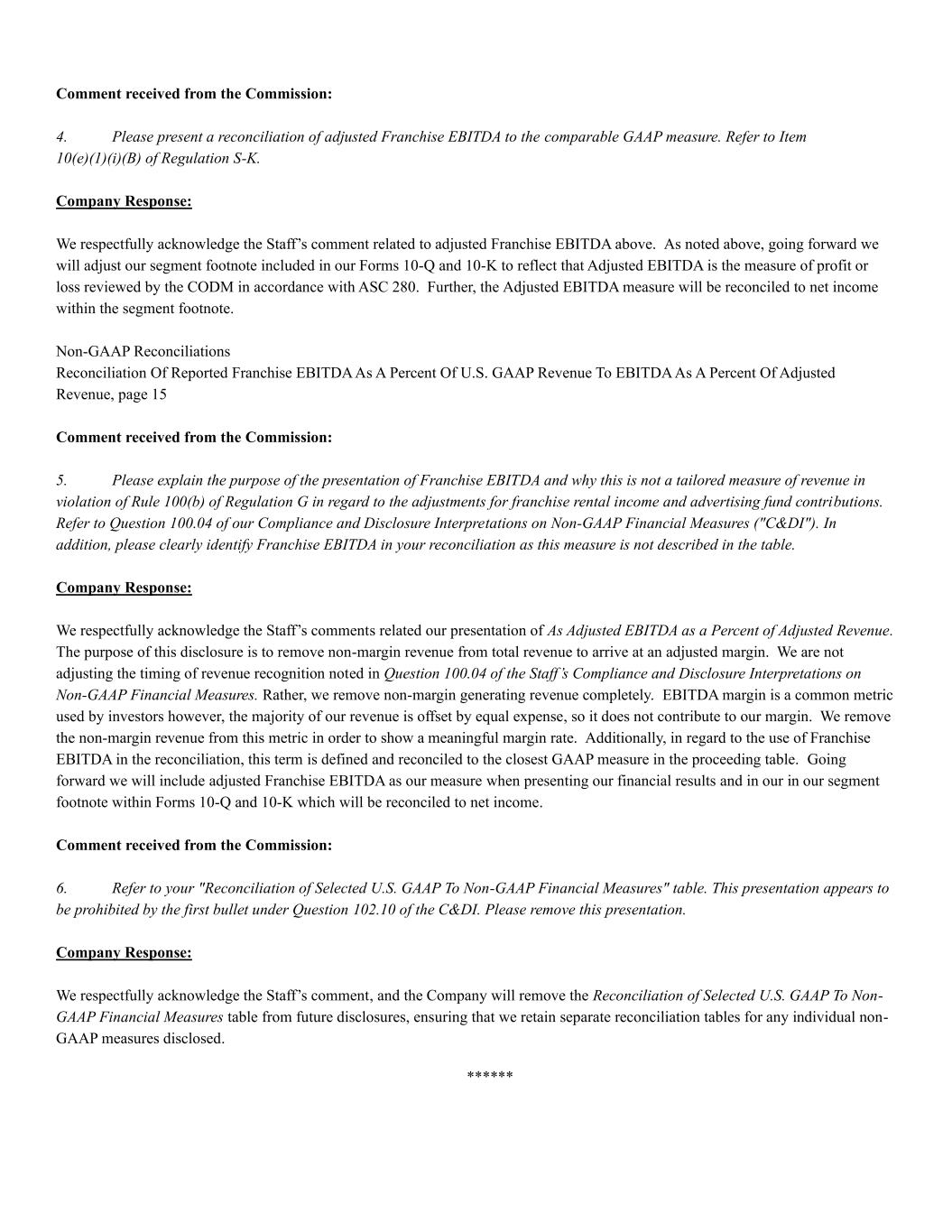 Comment received from the Commission: 4. Please present a reconciliation of adjusted Franchise EBITDA to the comparable GAAP measure. Refer to Item 10(e)(1)(i)(B) of Regulation S-K. Company Response: We respectfully acknowledge the Staff’s comment related to adjusted Franchise EBITDA above. As noted above, going forward we will adjust our segment footnote included in our Forms 10-Q and 10-K to reflect that Adjusted EBITDA is the measure of profit or loss reviewed by the CODM in accordance with ASC 280. Further, the Adjusted EBITDA measure will be reconciled to net income within the segment footnote. Non-GAAP Reconciliations Reconciliation Of Reported Franchise EBITDA As A Percent Of U.S. GAAP Revenue To EBITDA As A Percent Of Adjusted Revenue, page 15 Comment received from the Commission: 5. Please explain the purpose of the presentation of Franchise EBITDA and why this is not a tailored measure of revenue in violation of Rule 100(b) of Regulation G in regard to the adjustments for franchise rental income and advertising fund contributions. Refer to Question 100.04 of our Compliance and Disclosure Interpretations on Non-GAAP Financial Measures ("C&DI"). In addition, please clearly identify Franchise EBITDA in your reconciliation as this measure is not described in the table. Company Response: We respectfully acknowledge the Staff’s comments related our presentation of As Adjusted EBITDA as a Percent of Adjusted Revenue. The purpose of this disclosure is to remove non-margin revenue from total revenue to arrive at an adjusted margin. We are not adjusting the timing of revenue recognition noted in Question 100.04 of the Staff’s Compliance and Disclosure Interpretations on Non-GAAP Financial Measures. Rather, we remove non-margin generating revenue completely. EBITDA margin is a common metric used by investors however, the majority of our revenue is offset by equal expense, so it does not contribute to our margin. We remove the non-margin revenue from this metric in order to show a meaningful margin rate. Additionally, in regard to the use of Franchise EBITDA in the reconciliation, this term is defined and reconciled to the closest GAAP measure in the proceeding table. Going forward we will include adjusted Franchise EBITDA as our measure when presenting our financial results and in our in our segment footnote within Forms 10-Q and 10-K which will be reconciled to net income. Comment received from the Commission: 6. Refer to your "Reconciliation of Selected U.S. GAAP To Non-GAAP Financial Measures" table. This presentation appears to be prohibited by the first bullet under Question 102.10 of the C&DI. Please remove this presentation. Company Response: We respectfully acknowledge the Staff’s comment, and the Company will remove the Reconciliation of Selected U.S. GAAP To Non- GAAP Financial Measures table from future disclosures, ensuring that we retain separate reconciliation tables for any individual non- GAAP measures disclosed. ******