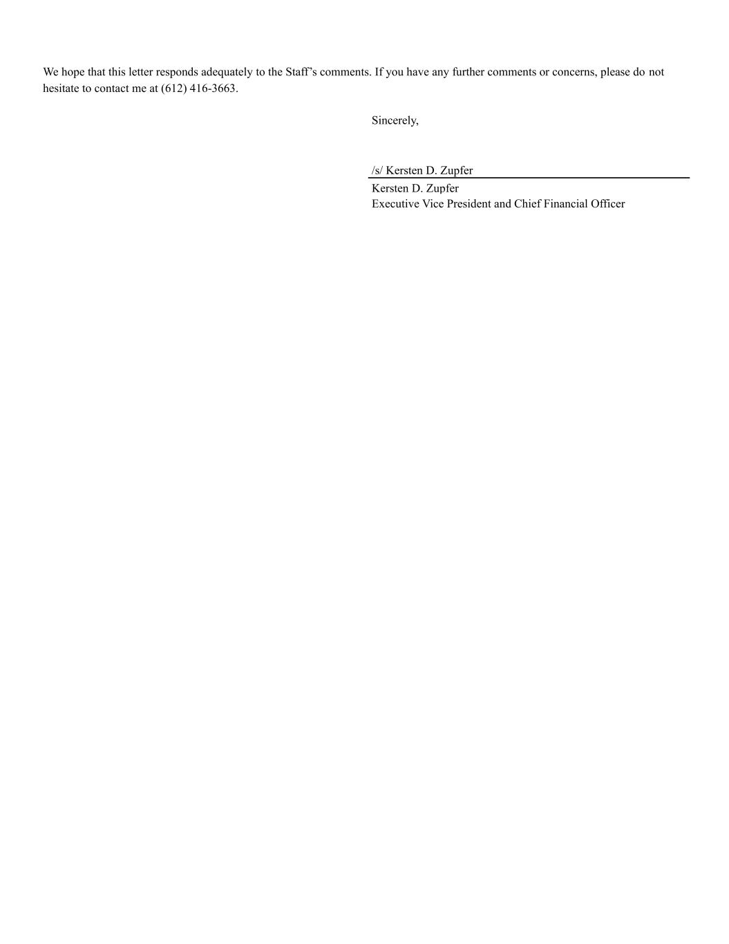 We hope that this letter responds adequately to the Staff’s comments. If you have any further comments or concerns, please do not hesitate to contact me at (612) 416-3663. Sincerely, /s/ Kersten D. Zupfer Kersten D. Zupfer Executive Vice President and Chief Financial Officer