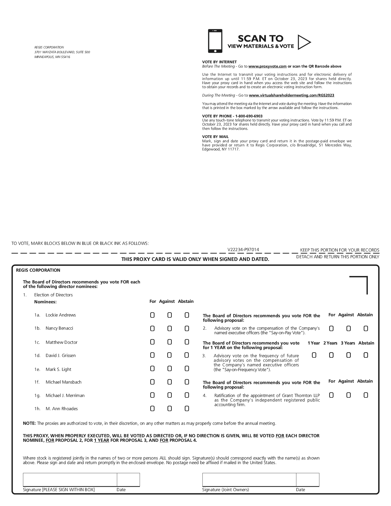 All shareholder nominations must be accompanied by a candidate resume that addresses the extent to which the nominee meets the director qualification standards. Nominations will be considered only if we are currently seeking to fill an open director position. All nominations by shareholders should be sent to the Chair of the Nominating and Corporate Governance Committee, c/o Chief Financial Officer, Regis Corporation, 3701 Wayzata Boulevard, Suite 500, Minneapolis, Minnesota 55416.