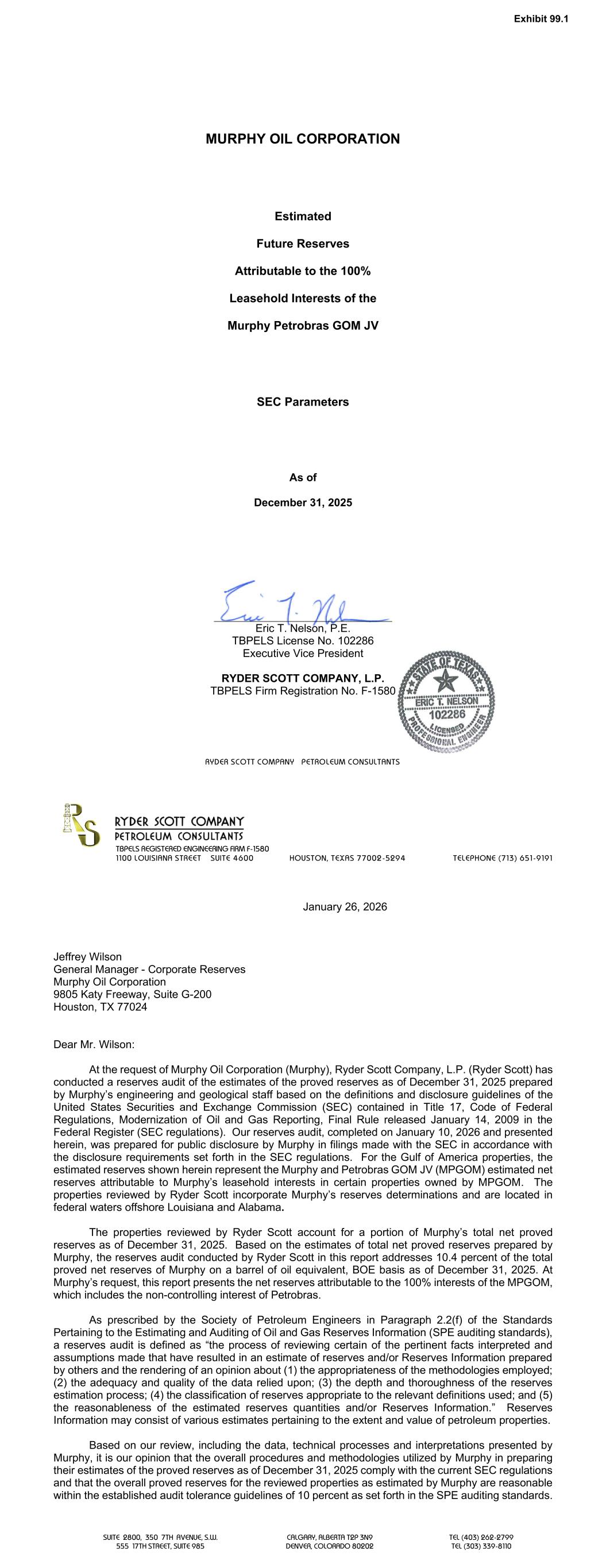 RYDER SCOTT COMPANY PETROLEUM CONSULTANTS MURPHY OIL CORPORATION Estimated Future Reserves Attributable to the 100% Leasehold Interests of the Murphy Petrobras GOM JV SEC Parameters As of December 31, 2025 Eric T. Nelson, P.E. TBPELS License No. 102286 Executive Vice President RYDER SCOTT COMPANY, L.P. TBPELS Firm Registration No. F-1580 SUITE 2800, 350 7TH AVENUE, S.W. CALGARY, ALBERTA T2P 3N9 TEL (403) 262-2799 555 17TH STREET, SUITE 985 DENVER, COLORADO 80202 TEL (303) 339-8110 TBPELS REGISTERED ENGINEERING FIRM F-1580 1100 LOUISIANA STREET SUITE 4600 HOUSTON, TEXAS 77002-5294 TELEPHONE (713) 651-9191 January 26, 2026 Jeffrey Wilson General Manager - Corporate Reserves Murphy Oil Corporation 9805 Katy Freeway, Suite G-200 Houston, TX 77024 Dear Mr. Wilson: At the request of Murphy Oil Corporation (Murphy), Ryder Scott Company, L.P. (Ryder Scott) has conducted a reserves audit of the estimates of the proved reserves as of December 31, 2025 prepared by Murphy’s engineering and geological staff based on the definitions and disclosure guidelines of the United States Securities and Exchange Commission (SEC) contained in Title 17, Code of Federal Regulations, Modernization of Oil and Gas Reporting, Final Rule released January 14, 2009 in the Federal Register (SEC regulations). Our reserves audit, completed on January 10, 2026 and presented herein, was prepared for public disclosure by Murphy in filings made with the SEC in accordance with the disclosure requirements set forth in the SEC regulations. For the Gulf of America properties, the estimated reserves shown herein represent the Murphy and Petrobras GOM JV (MPGOM) estimated net reserves attributable to Murphy’s leasehold interests in certain properties owned by MPGOM. The properties reviewed by Ryder Scott incorporate Murphy’s reserves determinations and are located in federal waters offshore Louisiana and Alabama. The properties reviewed by Ryder Scott account for a portion of Murphy’s total net proved reserves as of December 31, 2025. Based on the estimates of total net proved reserves prepared by Murphy, the reserves audit conducted by Ryder Scott in this report addresses 10.4 percent of the total proved net reserves of Murphy on a barrel of oil equivalent, BOE basis as of December 31, 2025. At Murphy’s request, this report presents the net reserves attributable to the 100% interests of the MPGOM, which includes the non-controlling interest of Petrobras. As prescribed by the Society of Petroleum Engineers in Paragraph 2.2(f) of the Standards Pertaining to the Estimating and Auditing of Oil and Gas Reserves Information (SPE auditing standards), a reserves audit is defined as “the process of reviewing certain of the pertinent facts interpreted and assumptions made that have resulted in an estimate of reserves and/or Reserves Information prepared by others and the rendering of an opinion about (1) the appropriateness of the methodologies employed; (2) the adequacy and quality of the data relied upon; (3) the depth and thoroughness of the reserves estimation process; (4) the classification of reserves appropriate to the relevant definitions used; and (5) the reasonableness of the estimated reserves quantities and/or Reserves Information.” Reserves Information may consist of various estimates pertaining to the extent and value of petroleum properties. Based on our review, including the data, technical processes and interpretations presented by Murphy, it is our opinion that the overall procedures and methodologies utilized by Murphy in preparing their estimates of the proved reserves as of December 31, 2025 comply with the current SEC regulations and that the overall proved reserves for the reviewed properties as estimated by Murphy are reasonable within the established audit tolerance guidelines of 10 percent as set forth in the SPE auditing standards.