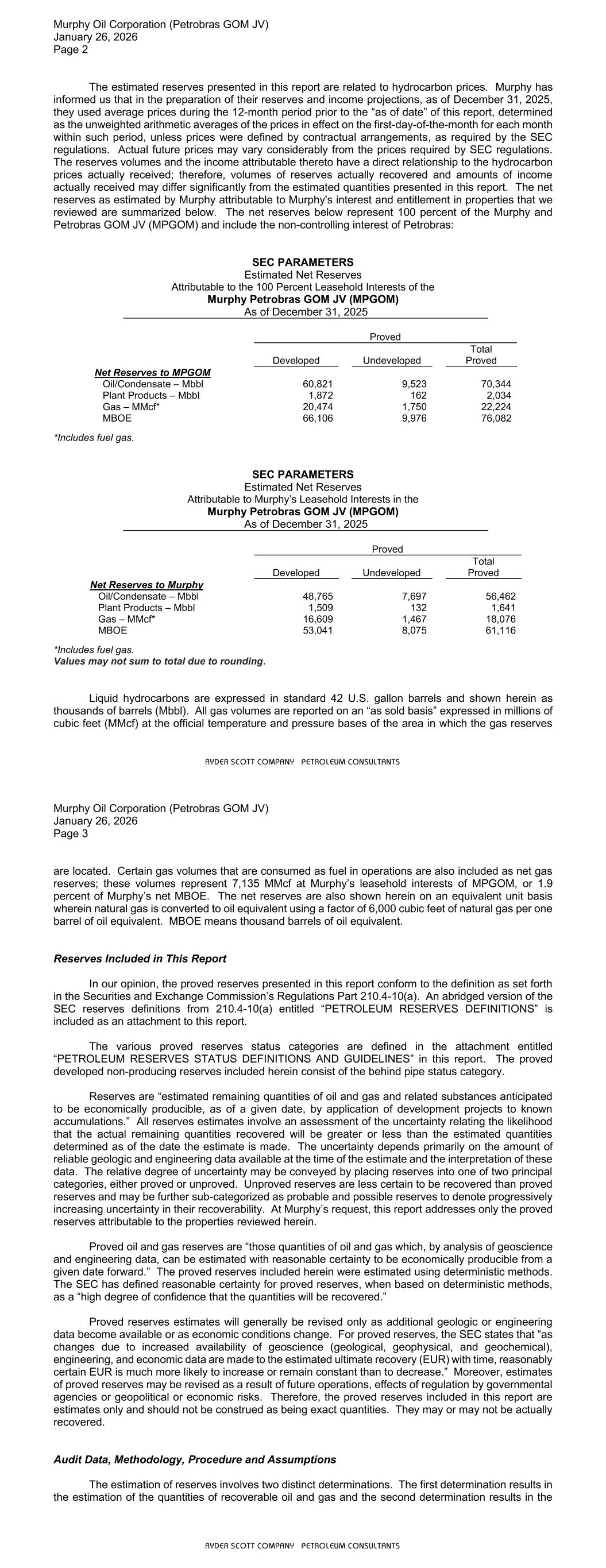 Murphy Oil Corporation (Petrobras GOM JV) January 26, 2026 Page 2 RYDER SCOTT COMPANY PETROLEUM CONSULTANTS The estimated reserves presented in this report are related to hydrocarbon prices. Murphy has informed us that in the preparation of their reserves and income projections, as of December 31, 2025, they used average prices during the 12-month period prior to the “as of date” of this report, determined as the unweighted arithmetic averages of the prices in effect on the first-day-of-the-month for each month within such period, unless prices were defined by contractual arrangements, as required by the SEC regulations. Actual future prices may vary considerably from the prices required by SEC regulations. The reserves volumes and the income attributable thereto have a direct relationship to the hydrocarbon prices actually received; therefore, volumes of reserves actually recovered and amounts of income actually received may differ significantly from the estimated quantities presented in this report. The net reserves as estimated by Murphy attributable to Murphy's interest and entitlement in properties that we reviewed are summarized below. The net reserves below represent 100 percent of the Murphy and Petrobras GOM JV (MPGOM) and include the non-controlling interest of Petrobras: SEC PARAMETERS Estimated Net Reserves Attributable to the 100 Percent Leasehold Interests of the Murphy Petrobras GOM JV (MPGOM) As of December 31, 2025 Proved Total Developed Undeveloped Proved Net Reserves to MPGOM Oil/Condensate – Mbbl 60,821 9,523 70,344 Plant Products – Mbbl 1,872 162 2,034 Gas – MMcf* 20,474 1,750 22,224 MBOE 66,106 9,976 76,082 *Includes fuel gas. SEC PARAMETERS Estimated Net Reserves Attributable to Murphy’s Leasehold Interests in the Murphy Petrobras GOM JV (MPGOM) As of December 31, 2025 Proved Total Developed Undeveloped Proved Net Reserves to Murphy Oil/Condensate – Mbbl 48,765 7,697 56,462 Plant Products – Mbbl 1,509 132 1,641 Gas – MMcf* 16,609 1,467 18,076 MBOE 53,041 8,075 61,116 *Includes fuel gas. Values may not sum to total due to rounding. Liquid hydrocarbons are expressed in standard 42 U.S. gallon barrels and shown herein as thousands of barrels (Mbbl). All gas volumes are reported on an “as sold basis” expressed in millions of cubic feet (MMcf) at the official temperature and pressure bases of the area in which the gas reserves Murphy Oil Corporation (Petrobras GOM JV) January 26, 2026 Page 3 RYDER SCOTT COMPANY PETROLEUM CONSULTANTS are located. Certain gas volumes that are consumed as fuel in operations are also included as net gas reserves; these volumes represent 7,135 MMcf at Murphy’s leasehold interests of MPGOM, or 1.9 percent of Murphy’s net MBOE. The net reserves are also shown herein on an equivalent unit basis wherein natural gas is converted to oil equivalent using a factor of 6,000 cubic feet of natural gas per one barrel of oil equivalent. MBOE means thousand barrels of oil equivalent. Reserves Included in This Report In our opinion, the proved reserves presented in this report conform to the definition as set forth in the Securities and Exchange Commission’s Regulations Part 210.4-10(a). An abridged version of the SEC reserves definitions from 210.4-10(a) entitled “PETROLEUM RESERVES DEFINITIONS” is included as an attachment to this report. The various proved reserves status categories are defined in the attachment entitled “PETROLEUM RESERVES STATUS DEFINITIONS AND GUIDELINES” in this report. The proved developed non-producing reserves included herein consist of the behind pipe status category. Reserves are “estimated remaining quantities of oil and gas and related substances anticipated to be economically producible, as of a given date, by application of development projects to known accumulations.” All reserves estimates involve an assessment of the uncertainty relating the likelihood that the actual remaining quantities recovered will be greater or less than the estimated quantities determined as of the date the estimate is made. The uncertainty depends primarily on the amount of reliable geologic and engineering data available at the time of the estimate and the interpretation of these data. The relative degree of uncertainty may be conveyed by placing reserves into one of two principal categories, either proved or unproved. Unproved reserves are less certain to be recovered than proved reserves and may be further sub-categorized as probable and possible reserves to denote progressively increasing uncertainty in their recoverability. At Murphy’s request, this report addresses only the proved reserves attributable to the properties reviewed herein. Proved oil and gas reserves are “those quantities of oil and gas which, by analysis of geoscience and engineering data, can be estimated with reasonable certainty to be economically producible from a given date forward.” The proved reserves included herein were estimated using deterministic methods. The SEC has defined reasonable certainty for proved reserves, when based on deterministic methods, as a “high degree of confidence that the quantities will be recovered.” Proved reserves estimates will generally be revised only as additional geologic or engineering data become available or as economic conditions change. For proved reserves, the SEC states that “as changes due to increased availability of geoscience (geological, geophysical, and geochemical), engineering, and economic data are made to the estimated ultimate recovery (EUR) with time, reasonably certain EUR is much more likely to increase or remain constant than to decrease.” Moreover, estimates of proved reserves may be revised as a result of future operations, effects of regulation by governmental agencies or geopolitical or economic risks. Therefore, the proved reserves included in this report are estimates only and should not be construed as being exact quantities. They may or may not be actu