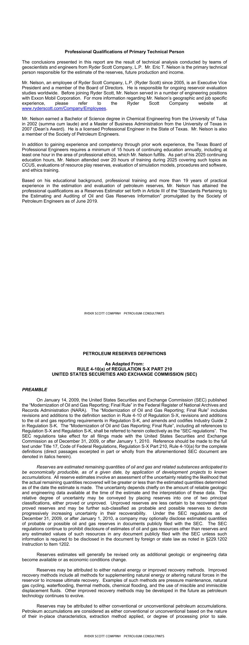 RYDER SCOTT COMPANY PETROLEUM CONSULTANTS Professional Qualifications of Primary Technical Person The conclusions presented in this report are the result of technical analysis conducted by teams of geoscientists and engineers from Ryder Scott Company, L.P. Mr. Eric T. Nelson is the primary technical person responsible for the estimate of the reserves, future production and income. Mr. Nelson, an employee of Ryder Scott Company, L.P. (Ryder Scott) since 2005, is an Executive Vice President and a member of the Board of Directors. He is responsible for ongoing reservoir evaluation studies worldwide. Before joining Ryder Scott, Mr. Nelson served in a number of engineering positions with Exxon Mobil Corporation. For more information regarding Mr. Nelson’s geographic and job specific experience, please refer to the Ryder Scott Company website at www.ryderscott.com/Company/Employees. Mr. Nelson earned a Bachelor of Science degree in Chemical Engineering from the University of Tulsa in 2002 (summa cum laude) and a Master of Business Administration from the University of Texas in 2007 (Dean’s Award). He is a licensed Professional Engineer in the State of Texas. Mr. Nelson is also a member of the Society of Petroleum Engineers. In addition to gaining experience and competency through prior work experience, the Texas Board of Professional Engineers requires a minimum of 15 hours of continuing education annually, including at least one hour in the area of professional ethics, which Mr. Nelson fulfills. As part of his 2025 continuing education hours, Mr. Nelson attended over 20 hours of training during 2025 covering such topics as CCUS, evaluations of resource play reserves, evaluation of simulation models, procedures and software, and ethics training. Based on his educational background, professional training and more than 19 years of practical experience in the estimation and evaluation of petroleum reserves, Mr. Nelson has attained the professional qualifications as a Reserves Estimator set forth in Article III of the “Standards Pertaining to the Estimating and Auditing of Oil and Gas Reserves Information” promulgated by the Society of Petroleum Engineers as of June 2019. RYDER SCOTT COMPANY PETROLEUM CONSULTANTS PETROLEUM RESERVES DEFINITIONS As Adapted From: RULE 4-10(a) of REGULATION S-X PART 210 UNITED STATES SECURITIES AND EXCHANGE COMMISSION (SEC) PREAMBLE On January 14, 2009, the United States Securities and Exchange Commission (SEC) published the “Modernization of Oil and Gas Reporting; Final Rule” in the Federal Register of National Archives and Records Administration (NARA). The “Modernization of Oil and Gas Reporting; Final Rule” includes revisions and additions to the definition section in Rule 4-10 of Regulation S-X, revisions and additions to the oil and gas reporting requirements in Regulation S-K, and amends and codifies Industry Guide 2 in Regulation S-K. The “Modernization of Oil and Gas Reporting; Final Rule”, including all references to Regulation S-X and Regulation S-K, shall be referred to herein collectively as the “SEC regulations”. The SEC regulations take effect for all filings made with the United States Securities and Exchange Commission as of December 31, 2009, or after January 1, 2010. Reference should be made to the full text under Title 17, Code of Federal Regulations, Regulation S-X Part 210, Rule 4-10(a) for the complete definitions (direct passages excerpted in part or wholly from the aforementioned SEC document are denoted in italics herein). Reserves are estimated remaining quantities of oil and gas and related substances anticipated to be economically producible, as of a given date, by application of development projects to known accumulations. All reserve estimates involve an assessment of the uncertainty relating the likelihood that the actual remaining quantities recovered will be greater or less than the estimated quantities determined as of the date the estimate is made. The uncertainty depends chiefly on the amount of reliable geologic and engineering data available at the time of the estimate and the interpretation of these data. The relative degree of uncertainty may be conveyed by placing reserves into one of two principal classifications, either proved or unproved. Unproved reserves are less certain to be recovered than proved reserves and may be further sub-classified as probable and possible reserves to denote progressively increasing uncertainty in their recoverability. Under the SEC regulations as of December 31, 2009, or after January 1, 2010, a company may optionally disclose estimated quantities of probable or possible oil and gas reserves in documents publicly filed with the SEC. The SEC regulations continue to prohibit disclosure of estimates of oil and gas resources other than reserves and any estimated values of such resources in any document publicly filed with the SEC unless such information is required to be disclosed in the document by foreign or state law as noted in §229.1202 Instruction to Item 1202. Reserves estimates will generally be revised only as additional geologic or engineering data become available or as economic conditions change. Reserves may be attributed to either natural energy or improved recovery methods. Improved recovery methods include all methods for supplementing natural energy or altering natural forces in the reservoir to increase ultimate recovery. Examples of such methods are pressure maintenance, natural gas cycling, waterflooding, thermal methods, chemical flooding, and the use of miscible and immiscible displacement fluids. Other improved recovery methods may be developed in the future as petroleum technology continues to evolve. Reserves may be attributed to either conventional or unconventional petroleum accumulations. Petroleum accumulations are considered as either conventional or unconventional based on the nature of their in-place characteristics, extraction method applied,