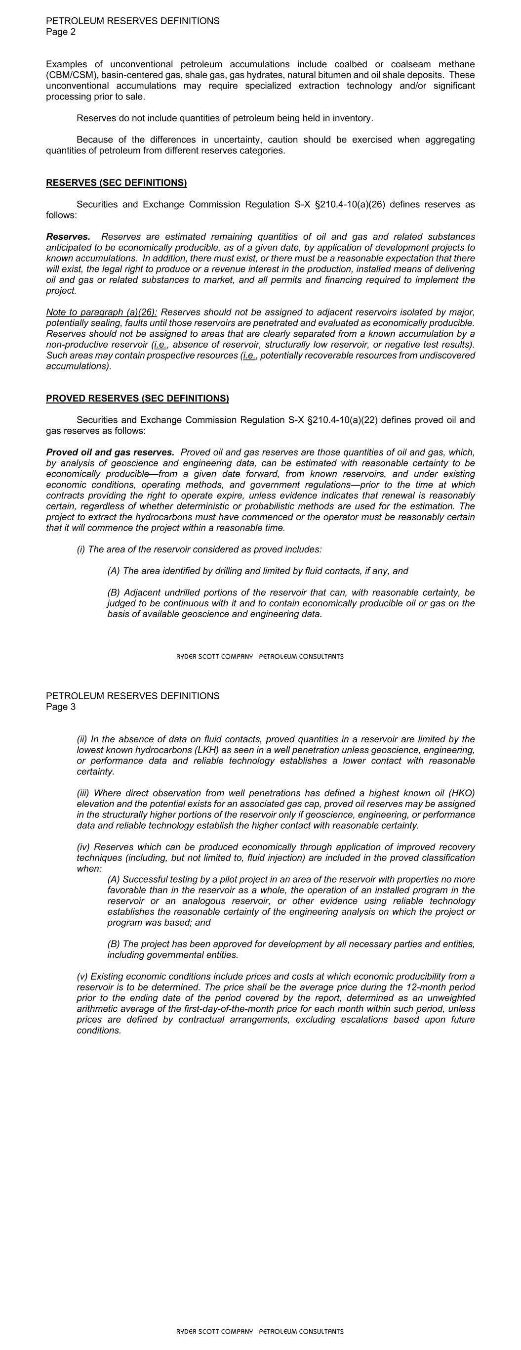 PETROLEUM RESERVES DEFINITIONS Page 2 RYDER SCOTT COMPANY PETROLEUM CONSULTANTS Examples of unconventional petroleum accumulations include coalbed or coalseam methane (CBM/CSM), basin-centered gas, shale gas, gas hydrates, natural bitumen and oil shale deposits. These unconventional accumulations may require specialized extraction technology and/or significant processing prior to sale. Reserves do not include quantities of petroleum being held in inventory. Because of the differences in uncertainty, caution should be exercised when aggregating quantities of petroleum from different reserves categories. RESERVES (SEC DEFINITIONS) Securities and Exchange Commission Regulation S-X §210.4-10(a)(26) defines reserves as follows: Reserves. Reserves are estimated remaining quantities of oil and gas and related substances anticipated to be economically producible, as of a given date, by application of development projects to known accumulations. In addition, there must exist, or there must be a reasonable expectation that there will exist, the legal right to produce or a revenue interest in the production, installed means of delivering oil and gas or related substances to market, and all permits and financing required to implement the project. Note to paragraph (a)(26): Reserves should not be assigned to adjacent reservoirs isolated by major, potentially sealing, faults until those reservoirs are penetrated and evaluated as economically producible. Reserves should not be assigned to areas that are clearly separated from a known accumulation by a non-productive reservoir (i.e., absence of reservoir, structurally low reservoir, or negative test results). Such areas may contain prospective resources (i.e., potentially recoverable resources from undiscovered accumulations). PROVED RESERVES (SEC DEFINITIONS) Securities and Exchange Commission Regulation S-X §210.4-10(a)(22) defines proved oil and gas reserves as follows: Proved oil and gas reserves. Proved oil and gas reserves are those quantities of oil and gas, which, by analysis of geoscience and engineering data, can be estimated with reasonable certainty to be economically producible—from a given date forward, from known reservoirs, and under existing economic conditions, operating methods, and government regulations—prior to the time at which contracts providing the right to operate expire, unless evidence indicates that renewal is reasonably certain, regardless of whether deterministic or probabilistic methods are used for the estimation. The project to extract the hydrocarbons must have commenced or the operator must be reasonably certain that it will commence the project within a reasonable time. (i) The area of the reservoir considered as proved includes: (A) The area identified by drilling and limited by fluid contacts, if any, and (B) Adjacent undrilled portions of the reservoir that can, with reasonable certainty, be judged to be continuous with it and to contain economically producible oil or gas on the basis of available geoscience and engineering data. PETROLEUM RESERVES DEFINITIONS Page 3 RYDER SCOTT COMPANY PETROLEUM CONSULTANTS (ii) In the absence of data on fluid contacts, proved quantities in a reservoir are limited by the lowest known hydrocarbons (LKH) as seen in a well penetration unless geoscience, engineering, or performance data and reliable technology establishes a lower contact with reasonable certainty. (iii) Where direct observation from well penetrations has defined a highest known oil (HKO) elevation and the potential exists for an associated gas cap, proved oil reserves may be assigned in the structurally higher portions of the reservoir only if geoscience, engineering, or performance data and reliable technology establish the higher contact with reasonable certainty. (iv) Reserves which can be produced economically through application of improved recovery techniques (including, but not limited to, fluid injection) are included in the proved classification when: (A) Successful testing by a pilot project in an area of the reservoir with properties no more favorable than in the reservoir as a whole, the operation of an installed program in the reservoir or an analogous reservoir, or other evidence using reliable technology establishes the reasonable certainty of the engineering analysis on which the project or program was based; and (B) The project has been approved for development by all necessary parties and entities, including governmental entities. (v) Existing economic conditions include prices and costs at which economic producibility from a reservoir is to be determined. The price shall be the average price during the 12-month period prior to the ending date of the period covered by the report, determined as an unweighted arithmetic average of the first-day-of-the-month price for each month within such period, unless prices are defined by contractual arrangements, excluding escalations based upon future conditions.