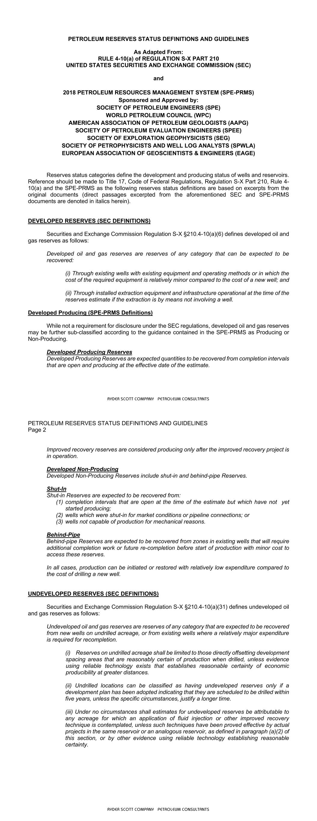 RYDER SCOTT COMPANY PETROLEUM CONSULTANTS PETROLEUM RESERVES STATUS DEFINITIONS AND GUIDELINES As Adapted From: RULE 4-10(a) of REGULATION S-X PART 210 UNITED STATES SECURITIES AND EXCHANGE COMMISSION (SEC) and 2018 PETROLEUM RESOURCES MANAGEMENT SYSTEM (SPE-PRMS) Sponsored and Approved by: SOCIETY OF PETROLEUM ENGINEERS (SPE) WORLD PETROLEUM COUNCIL (WPC) AMERICAN ASSOCIATION OF PETROLEUM GEOLOGISTS (AAPG) SOCIETY OF PETROLEUM EVALUATION ENGINEERS (SPEE) SOCIETY OF EXPLORATION GEOPHYSICISTS (SEG) SOCIETY OF PETROPHYSICISTS AND WELL LOG ANALYSTS (SPWLA) EUROPEAN ASSOCIATION OF GEOSCIENTISTS & ENGINEERS (EAGE) Reserves status categories define the development and producing status of wells and reservoirs. Reference should be made to Title 17, Code of Federal Regulations, Regulation S-X Part 210, Rule 4- 10(a) and the SPE-PRMS as the following reserves status definitions are based on excerpts from the original documents (direct passages excerpted from the aforementioned SEC and SPE-PRMS documents are denoted in italics herein). DEVELOPED RESERVES (SEC DEFINITIONS) Securities and Exchange Commission Regulation S-X §210.4-10(a)(6) defines developed oil and gas reserves as follows: Developed oil and gas reserves are reserves of any category that can be expected to be recovered: (i) Through existing wells with existing equipment and operating methods or in which the cost of the required equipment is relatively minor compared to the cost of a new well; and (ii) Through installed extraction equipment and infrastructure operational at the time of the reserves estimate if the extraction is by means not involving a well. Developed Producing (SPE-PRMS Definitions) While not a requirement for disclosure under the SEC regulations, developed oil and gas reserves may be further sub-classified according to the guidance contained in the SPE-PRMS as Producing or Non-Producing. Developed Producing Reserves Developed Producing Reserves are expected quantities to be recovered from completion intervals that are open and producing at the effective date of the estimate. PETROLEUM RESERVES STATUS DEFINITIONS AND GUIDELINES Page 2 RYDER SCOTT COMPANY PETROLEUM CONSULTANTS Improved recovery reserves are considered producing only after the improved recovery project is in operation. Developed Non-Producing Developed Non-Producing Reserves include shut-in and behind-pipe Reserves. Shut-In Shut-in Reserves are expected to be recovered from: (1) completion intervals that are open at the time of the estimate but which have not yet started producing; (2) wells which were shut-in for market conditions or pipeline connections; or (3) wells not capable of production for mechanical reasons. Behind-Pipe Behind-pipe Reserves are expected to be recovered from zones in existing wells that will require additional completion work or future re-completion before start of production with minor cost to access these reserves. In all cases, production can be initiated or restored with relatively low expenditure compared to the cost of drilling a new well. UNDEVELOPED RESERVES (SEC DEFINITIONS) Securities and Exchange Commission Regulation S-X §210.4-10(a)(31) defines undeveloped oil and gas reserves as follows: Undeveloped oil and gas reserves are reserves of any category that are expected to be recovered from new wells on undrilled acreage, or from existing wells where a relatively major expenditure is required for recompletion. (i) Reserves on undrilled acreage shall be limited to those directly offsetting development spacing areas that are reasonably certain of production when drilled, unless evidence using reliable technology exists that establishes reasonable certainty of economic producibility at greater distances. (ii) Undrilled locations can be classified as having undeveloped reserves only if a development plan has been adopted indicating that they are scheduled to be drilled within five years, unless the specific circumstances, justify a longer time. (iii) Under no circumstances shall estimates for undeveloped reserves be attributable to any acreage for which an application of fluid injection or other improved recovery technique is contemplated, unless such techniques have been proved effective by actual projects in the same reservoir or an analogous reservoir, as defined in paragraph (a)(2) of this section, or by other evidence using reliable technology establishing reasonable certainty.