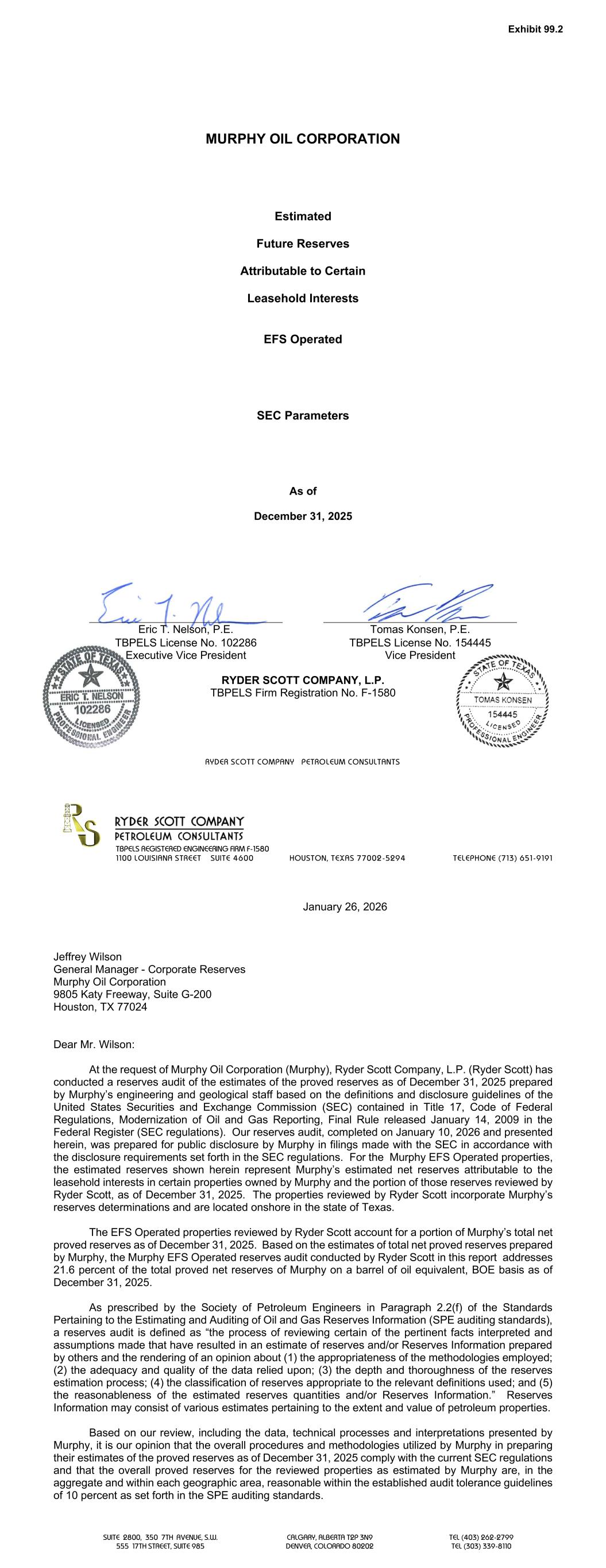 RYDER SCOTT COMPANY PETROLEUM CONSULTANTS MURPHY OIL CORPORATION Estimated Future Reserves Attributable to Certain Leasehold Interests EFS Operated SEC Parameters As of December 31, 2025 Eric T. Nelson, P.E. Tomas Konsen, P.E. TBPELS License No. 102286 TBPELS License No. 154445 Executive Vice President Vice President RYDER SCOTT COMPANY, L.P. TBPELS Firm Registration No. F-1580 .2 SUITE 2800, 350 7TH AVENUE, S.W. CALGARY, ALBERTA T2P 3N9 TEL (403) 262-2799 555 17TH STREET, SUITE 985 DENVER, COLORADO 80202 TEL (303) 339-8110 TBPELS REGISTERED ENGINEERING FIRM F-1580 1100 LOUISIANA STREET SUITE 4600 HOUSTON, TEXAS 77002-5294 TELEPHONE (713) 651-9191 January 26, 2026 Jeffrey Wilson General Manager - Corporate Reserves Murphy Oil Corporation 9805 Katy Freeway, Suite G-200 Houston, TX 77024 Dear Mr. Wilson: At the request of Murphy Oil Corporation (Murphy), Ryder Scott Company, L.P. (Ryder Scott) has conducted a reserves audit of the estimates of the proved reserves as of December 31, 2025 prepared by Murphy’s engineering and geological staff based on the definitions and disclosure guidelines of the United States Securities and Exchange Commission (SEC) contained in Title 17, Code of Federal Regulations, Modernization of Oil and Gas Reporting, Final Rule released January 14, 2009 in the Federal Register (SEC regulations). Our reserves audit, completed on January 10, 2026 and presented herein, was prepared for public disclosure by Murphy in filings made with the SEC in accordance with the disclosure requirements set forth in the SEC regulations. For the Murphy EFS Operated properties, the estimated reserves shown herein represent Murphy’s estimated net reserves attributable to the leasehold interests in certain properties owned by Murphy and the portion of those reserves reviewed by Ryder Scott, as of December 31, 2025. The properties reviewed by Ryder Scott incorporate Murphy’s reserves determinations and are located onshore in the state of Texas. The EFS Operated properties reviewed by Ryder Scott account for a portion of Murphy’s total net proved reserves as of December 31, 2025. Based on the estimates of total net proved reserves prepared by Murphy, the Murphy EFS Operated reserves audit conducted by Ryder Scott in this report addresses 21.6 percent of the total proved net reserves of Murphy on a barrel of oil equivalent, BOE basis as of December 31, 2025. As prescribed by the Society of Petroleum Engineers in Paragraph 2.2(f) of the Standards Pertaining to the Estimating and Auditing of Oil and Gas Reserves Information (SPE auditing standards), a reserves audit is defined as “the process of reviewing certain of the pertinent facts interpreted and assumptions made that have resulted in an estimate of reserves and/or Reserves Information prepared by others and the rendering of an opinion about (1) the appropriateness of the methodologies employed; (2) the adequacy and quality of the data relied upon; (3) the depth and thoroughness of the reserves estimation process; (4) the classification of reserves appropriate to the relevant definitions used; and (5) the reasonableness of the estimated reserves quantities and/or Reserves Information.” Reserves Information may consist of various estimates pertaining to the extent and value of petroleum properties. Based on our review, including the data, technical processes and interpretations presented by Murphy, it is our opinion that the overall procedures and methodologies utilized by Murphy in preparing their estimates of the proved reserves as of December 31, 2025 comply with the current SEC regulations and that the overall proved reserves for the reviewed properties as estimated by Murphy are, in the aggregate and within each geographic area, reasonable within the established audit tolerance guidelines of 10 percent as set forth in the SPE auditing standards.