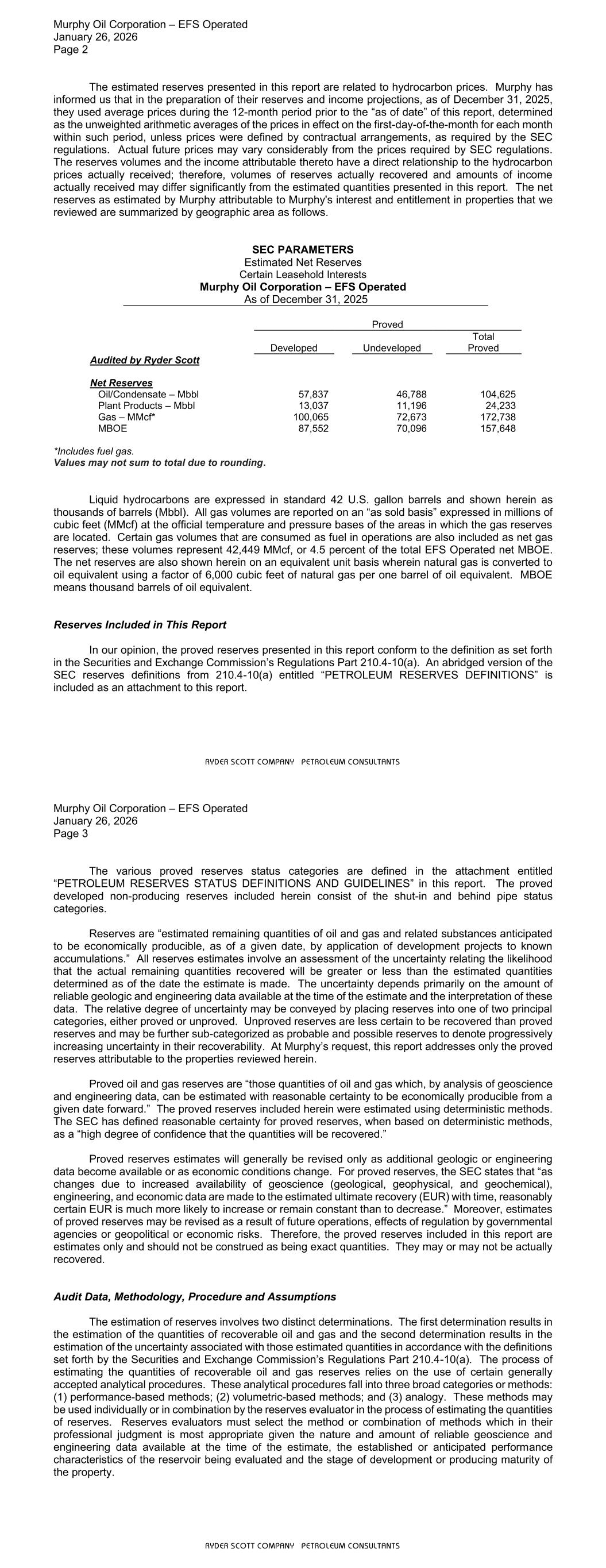 Murphy Oil Corporation – EFS Operated January 26, 2026 Page 2 RYDER SCOTT COMPANY PETROLEUM CONSULTANTS The estimated reserves presented in this report are related to hydrocarbon prices. Murphy has informed us that in the preparation of their reserves and income projections, as of December 31, 2025, they used average prices during the 12-month period prior to the “as of date” of this report, determined as the unweighted arithmetic averages of the prices in effect on the first-day-of-the-month for each month within such period, unless prices were defined by contractual arrangements, as required by the SEC regulations. Actual future prices may vary considerably from the prices required by SEC regulations. The reserves volumes and the income attributable thereto have a direct relationship to the hydrocarbon prices actually received; therefore, volumes of reserves actually recovered and amounts of income actually received may differ significantly from the estimated quantities presented in this report. The net reserves as estimated by Murphy attributable to Murphy's interest and entitlement in properties that we reviewed are summarized by geographic area as follows. SEC PARAMETERS Estimated Net Reserves Certain Leasehold Interests Murphy Oil Corporation – EFS Operated As of December 31, 2025 Proved Total Developed Undeveloped Proved Audited by Ryder Scott Net Reserves Oil/Condensate – Mbbl 57,837 46,788 104,625 Plant Products – Mbbl 13,037 11,196 24,233 Gas – MMcf* 100,065 72,673 172,738 MBOE 87,552 70,096 157,648 *Includes fuel gas. Values may not sum to total due to rounding. Liquid hydrocarbons are expressed in standard 42 U.S. gallon barrels and shown herein as thousands of barrels (Mbbl). All gas volumes are reported on an “as sold basis” expressed in millions of cubic feet (MMcf) at the official temperature and pressure bases of the areas in which the gas reserves are located. Certain gas volumes that are consumed as fuel in operations are also included as net gas reserves; these volumes represent 42,449 MMcf, or 4.5 percent of the total EFS Operated net MBOE. The net reserves are also shown herein on an equivalent unit basis wherein natural gas is converted to oil equivalent using a factor of 6,000 cubic feet of natural gas per one barrel of oil equivalent. MBOE means thousand barrels of oil equivalent. Reserves Included in This Report In our opinion, the proved reserves presented in this report conform to the definition as set forth in the Securities and Exchange Commission’s Regulations Part 210.4-10(a). An abridged version of the SEC reserves definitions from 210.4-10(a) entitled “PETROLEUM RESERVES DEFINITIONS” is included as an attachment to this report. Murphy Oil Corporation – EFS Operated January 26, 2026 Page 3 RYDER SCOTT COMPANY PETROLEUM CONSULTANTS The various proved reserves status categories are defined in the attachment entitled “PETROLEUM RESERVES STATUS DEFINITIONS AND GUIDELINES” in this report. The proved developed non-producing reserves included herein consist of the shut-in and behind pipe status categories. Reserves are “estimated remaining quantities of oil and gas and related substances anticipated to be economically producible, as of a given date, by application of development projects to known accumulations.” All reserves estimates involve an assessment of the uncertainty relating the likelihood that the actual remaining quantities recovered will be greater or less than the estimated quantities determined as of the date the estimate is made. The uncertainty depends primarily on the amount of reliable geologic and engineering data available at the time of the estimate and the interpretation of these data. The relative degree of uncertainty may be conveyed by placing reserves into one of two principal categories, either proved or unproved. Unproved reserves are less certain to be recovered than proved reserves and may be further sub-categorized as probable and possible reserves to denote progressively increasing uncertainty in their recoverability. At Murphy’s request, this report addresses only the proved reserves attributable to the properties reviewed herein. Proved oil and gas reserves are “those quantities of oil and gas which, by analysis of geoscience and engineering data, can be estimated with reasonable certainty to be economically producible from a given date forward.” The proved reserves included herein were estimated using deterministic methods. The SEC has defined reasonable certainty for proved reserves, when based on deterministic methods, as a “high degree of confidence that the quantities will be recovered.” Proved reserves estimates will generally be revised only as additional geologic or engineering data become available or as economic conditions change. For proved reserves, the SEC states that “as changes due to increased availability of geoscience (geological, geophysical, and geochemical), engineering, and economic data are made to the estimated ultimate recovery (EUR) with time, reasonably certain EUR is much more likely to increase or remain constant than to decrease.” Moreover, estimates of proved reserves may be revised as a result of future operations, effects of regulation by governmental agencies or geopolitical or economic risks. Therefore, the proved reserves included in this report are estimates only and should not be construed as being exact quantities. They may or may not be actually recovered. Audit Data, Methodology, Procedure and Assumptions The estimation of reserves involves two distinct determinations. The first determination results in the estimation of the quantities of recoverable oil and gas and the second determination results in the estimation of the uncertainty associated with those estimated quantities in accordance with the definitions set forth by the Securities and Exchange Commission’s Regulations Part 210.4-10(a). The process of estimating the quantities of re