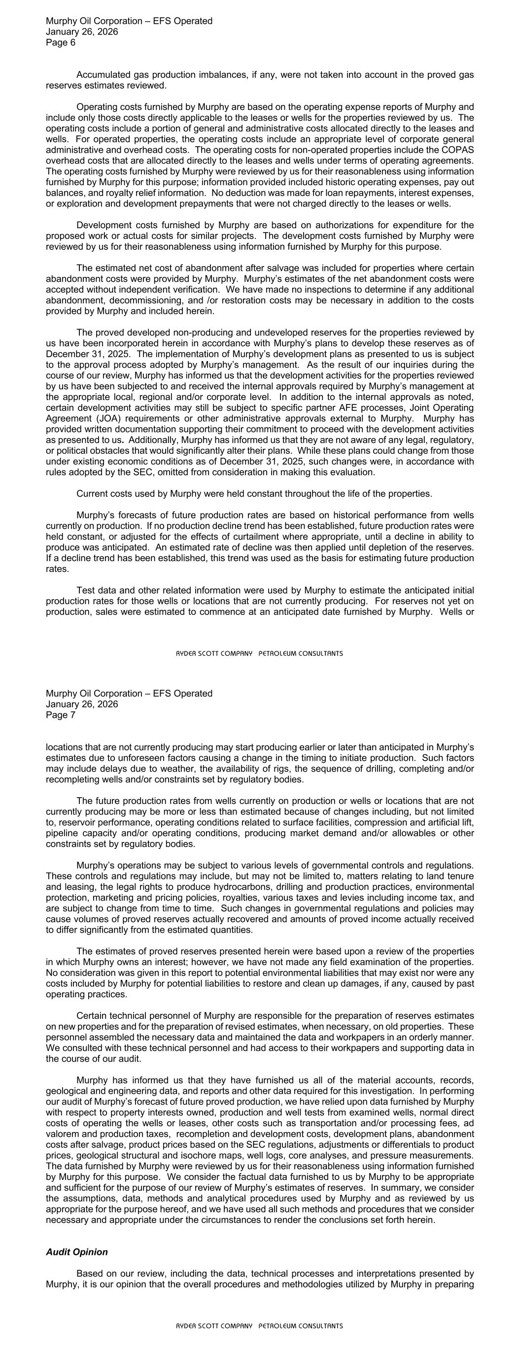 Murphy Oil Corporation – EFS Operated January 26, 2026 Page 6 RYDER SCOTT COMPANY PETROLEUM CONSULTANTS Accumulated gas production imbalances, if any, were not taken into account in the proved gas reserves estimates reviewed. Operating costs furnished by Murphy are based on the operating expense reports of Murphy and include only those costs directly applicable to the leases or wells for the properties reviewed by us. The operating costs include a portion of general and administrative costs allocated directly to the leases and wells. For operated properties, the operating costs include an appropriate level of corporate general administrative and overhead costs. The operating costs for non-operated properties include the COPAS overhead costs that are allocated directly to the leases and wells under terms of operating agreements. The operating costs furnished by Murphy were reviewed by us for their reasonableness using information furnished by Murphy for this purpose; information provided included historic operating expenses, pay out balances, and royalty relief information. No deduction was made for loan repayments, interest expenses, or exploration and development prepayments that were not charged directly to the leases or wells. Development costs furnished by Murphy are based on authorizations for expenditure for the proposed work or actual costs for similar projects. The development costs furnished by Murphy were reviewed by us for their reasonableness using information furnished by Murphy for this purpose. The estimated net cost of abandonment after salvage was included for properties where certain abandonment costs were provided by Murphy. Murphy’s estimates of the net abandonment costs were accepted without independent verification. We have made no inspections to determine if any additional abandonment, decommissioning, and /or restoration costs may be necessary in addition to the costs provided by Murphy and included herein. The proved developed non-producing and undeveloped reserves for the properties reviewed by us have been incorporated herein in accordance with Murphy’s plans to develop these reserves as of December 31, 2025. The implementation of Murphy’s development plans as presented to us is subject to the approval process adopted by Murphy’s management. As the result of our inquiries during the course of our review, Murphy has informed us that the development activities for the properties reviewed by us have been subjected to and received the internal approvals required by Murphy’s management at the appropriate local, regional and/or corporate level. In addition to the internal approvals as noted, certain development activities may still be subject to specific partner AFE processes, Joint Operating Agreement (JOA) requirements or other administrative approvals external to Murphy. Murphy has provided written documentation supporting their commitment to proceed with the development activities as presented to us. Additionally, Murphy has informed us that they are not aware of any legal, regulatory, or political obstacles that would significantly alter their plans. While these plans could change from those under existing economic conditions as of December 31, 2025, such changes were, in accordance with rules adopted by the SEC, omitted from consideration in making this evaluation. Current costs used by Murphy were held constant throughout the life of the properties. Murphy’s forecasts of future production rates are based on historical performance from wells currently on production. If no production decline trend has been established, future production rates were held constant, or adjusted for the effects of curtailment where appropriate, until a decline in ability to produce was anticipated. An estimated rate of decline was then applied until depletion of the reserves. If a decline trend has been established, this trend was used as the basis for estimating future production rates. Test data and other related information were used by Murphy to estimate the anticipated initial production rates for those wells or locations that are not currently producing. For reserves not yet on production, sales were estimated to commence at an anticipated date furnished by Murphy. Wells or Murphy Oil Corporation – EFS Operated January 26, 2026 Page 7 RYDER SCOTT COMPANY PETROLEUM CONSULTANTS locations that are not currently producing may start producing earlier or later than anticipated in Murphy’s estimates due to unforeseen factors causing a change in the timing to initiate production. Such factors may include delays due to weather, the availability of rigs, the sequence of drilling, completing and/or recompleting wells and/or constraints set by regulatory bodies. The future production rates from wells currently on production or wells or locations that are not currently producing may be more or less than estimated because of changes including, but not limited to, reservoir performance, operating conditions related to surface facilities, compression and artificial lift, pipeline capacity and/or operating conditions, producing market demand and/or allowables or other constraints set by regulatory bodies. Murphy’s operations may be subject to various levels of governmental controls and regulations. These controls and regulations may include, but may not be limited to, matters relating to land tenure and leasing, the legal rights to produce hydrocarbons, drilling and production practices, environmental protection, marketing and pricing policies, royalties, various taxes and levies including income tax, and are subject to change from time to time. Such changes in governmental regulations and policies may cause volumes of proved reserves actually recovered and amounts of proved income actually received to differ significantly from the estimated quantities. The estimates of proved reserves presented herein were based upon a review of the properties in which Murphy owns an intere