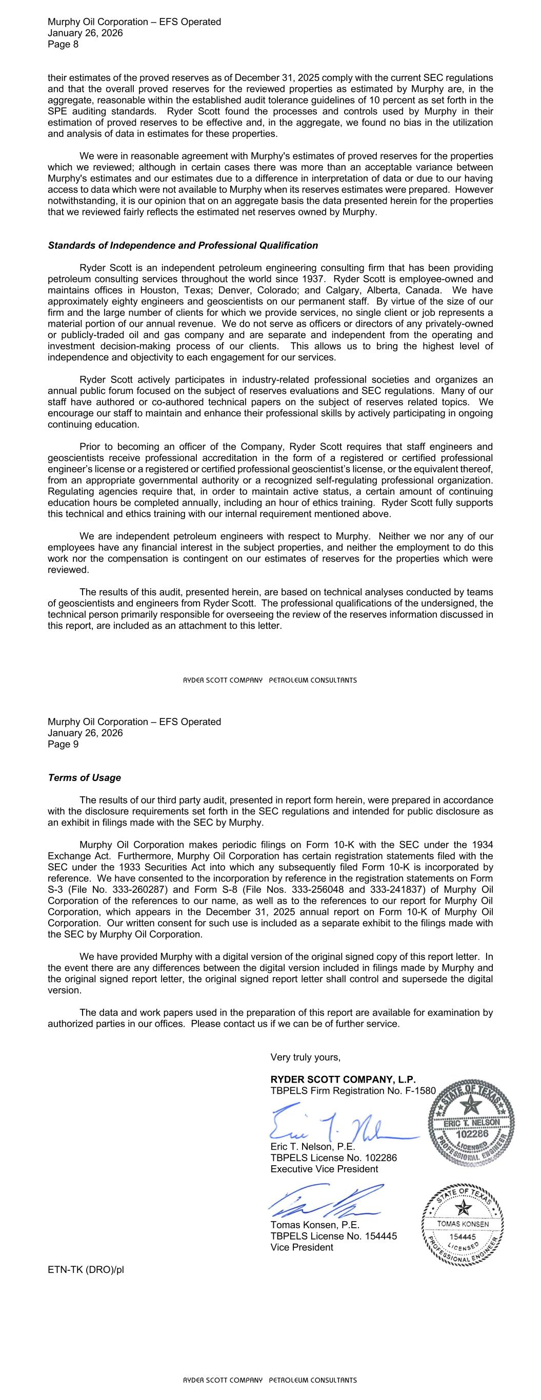 Murphy Oil Corporation – EFS Operated January 26, 2026 Page 8 RYDER SCOTT COMPANY PETROLEUM CONSULTANTS their estimates of the proved reserves as of December 31, 2025 comply with the current SEC regulations and that the overall proved reserves for the reviewed properties as estimated by Murphy are, in the aggregate, reasonable within the established audit tolerance guidelines of 10 percent as set forth in the SPE auditing standards. Ryder Scott found the processes and controls used by Murphy in their estimation of proved reserves to be effective and, in the aggregate, we found no bias in the utilization and analysis of data in estimates for these properties. We were in reasonable agreement with Murphy's estimates of proved reserves for the properties which we reviewed; although in certain cases there was more than an acceptable variance between Murphy's estimates and our estimates due to a difference in interpretation of data or due to our having access to data which were not available to Murphy when its reserves estimates were prepared. However notwithstanding, it is our opinion that on an aggregate basis the data presented herein for the properties that we reviewed fairly reflects the estimated net reserves owned by Murphy. Standards of Independence and Professional Qualification Ryder Scott is an independent petroleum engineering consulting firm that has been providing petroleum consulting services throughout the world since 1937. Ryder Scott is employee-owned and maintains offices in Houston, Texas; Denver, Colorado; and Calgary, Alberta, Canada. We have approximately eighty engineers and geoscientists on our permanent staff. By virtue of the size of our firm and the large number of clients for which we provide services, no single client or job represents a material portion of our annual revenue. We do not serve as officers or directors of any privately-owned or publicly-traded oil and gas company and are separate and independent from the operating and investment decision-making process of our clients. This allows us to bring the highest level of independence and objectivity to each engagement for our services. Ryder Scott actively participates in industry-related professional societies and organizes an annual public forum focused on the subject of reserves evaluations and SEC regulations. Many of our staff have authored or co-authored technical papers on the subject of reserves related topics. We encourage our staff to maintain and enhance their professional skills by actively participating in ongoing continuing education. Prior to becoming an officer of the Company, Ryder Scott requires that staff engineers and geoscientists receive professional accreditation in the form of a registered or certified professional engineer’s license or a registered or certified professional geoscientist’s license, or the equivalent thereof, from an appropriate governmental authority or a recognized self-regulating professional organization. Regulating agencies require that, in order to maintain active status, a certain amount of continuing education hours be completed annually, including an hour of ethics training. Ryder Scott fully supports this technical and ethics training with our internal requirement mentioned above. We are independent petroleum engineers with respect to Murphy. Neither we nor any of our employees have any financial interest in the subject properties, and neither the employment to do this work nor the compensation is contingent on our estimates of reserves for the properties which were reviewed. The results of this audit, presented herein, are based on technical analyses conducted by teams of geoscientists and engineers from Ryder Scott. The professional qualifications of the undersigned, the technical person primarily responsible for overseeing the review of the reserves information discussed in this report, are included as an attachment to this letter. Murphy Oil Corporation – EFS Operated January 26, 2026 Page 9 RYDER SCOTT COMPANY PETROLEUM CONSULTANTS Terms of Usage The results of our third party audit, presented in report form herein, were prepared in accordance with the disclosure requirements set forth in the SEC regulations and intended for public disclosure as an exhibit in filings made with the SEC by Murphy. Murphy Oil Corporation makes periodic filings on Form 10-K with the SEC under the 1934 Exchange Act. Furthermore, Murphy Oil Corporation has certain registration statements filed with the SEC under the 1933 Securities Act into which any subsequently filed Form 10-K is incorporated by reference. We have consented to the incorporation by reference in the registration statements on Form S-3 (File No. 333-260287) and Form S-8 (File Nos. 333-256048 and 333-241837) of Murphy Oil Corporation of the references to our name, as well as to the references to our report for Murphy Oil Corporation, which appears in the December 31, 2025 annual report on Form 10-K of Murphy Oil Corporation. Our written consent for such use is included as a separate exhibit to the filings made with the SEC by Murphy Oil Corporation. We have provided Murphy with a digital version of the original signed copy of this report letter. In the event there are any differences between the digital version included in filings made by Murphy and the original signed report letter, the original signed report letter shall control and supersede the digital version. The data and work papers used in the preparation of this report are available for examination by authorized parties in our offices. Please contact us if we can be of further service. Very truly yours, RYDER SCOTT COMPANY, L.P. TBPELS Firm Registration No. F-1580 Eric T. Nelson, P.E. TBPELS License No. 102286 Executive Vice President Tomas Konsen, P.E. TBPELS License No. 154445 Vice President ETN-TK (DRO)/pl