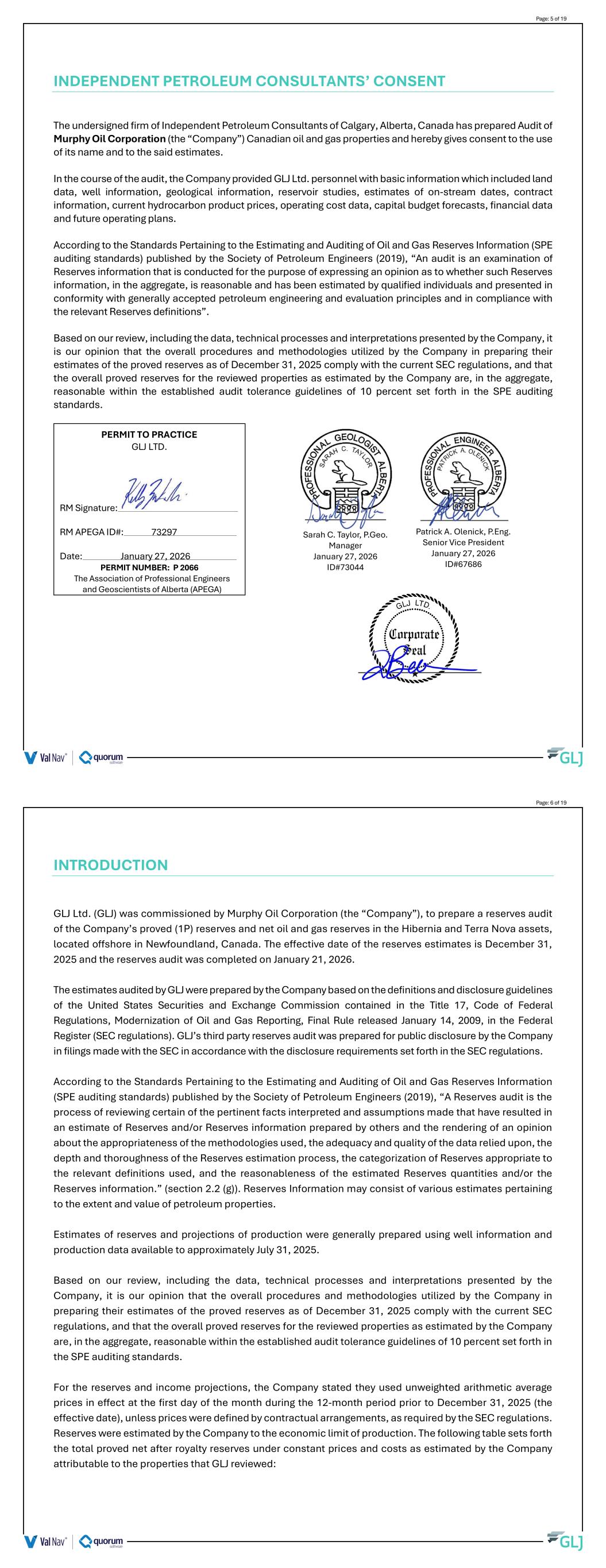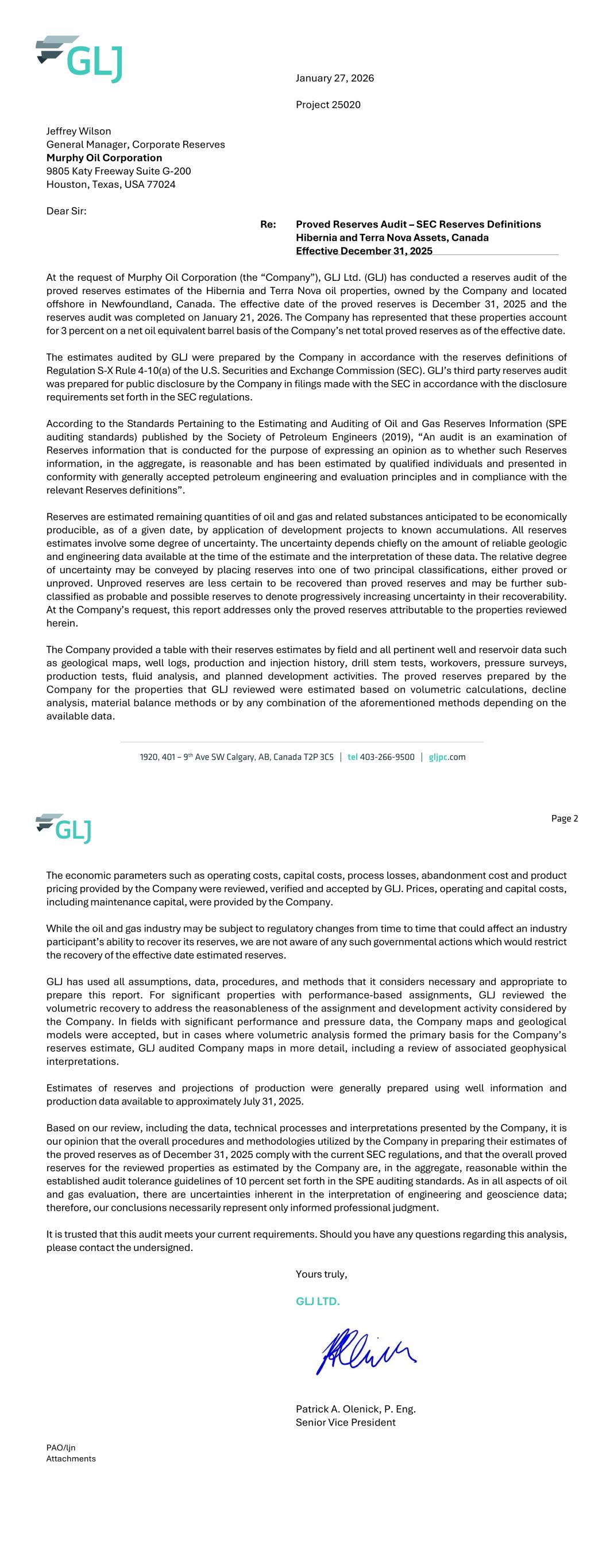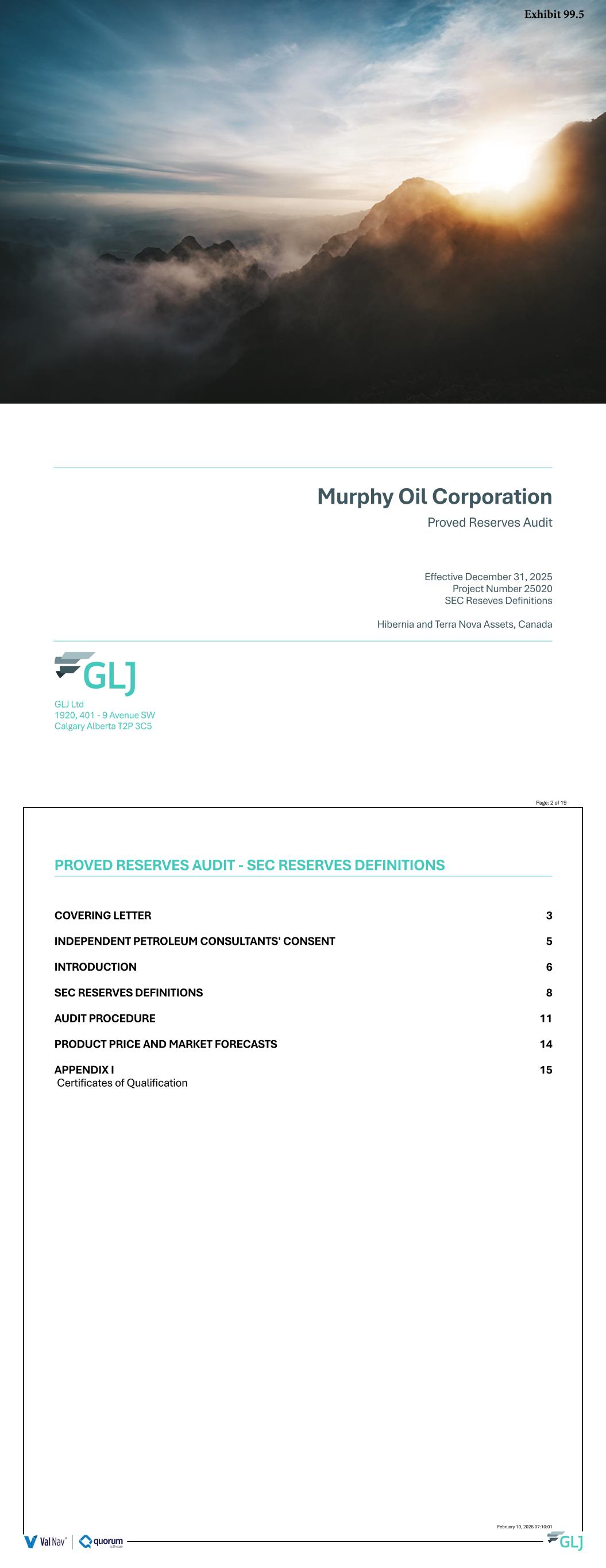 Murphy Oil Corporation Proved Reserves Audit Effective December 31, 2025 Project Number 25020 SEC Reseves Definitions Hibernia and Terra Nova Assets, Canada GLJ Ltd 1920, 401 - 9 Avenue SW Calgary Alberta T2P 3C5 .5 Page: 2 of 19 PROVED RESERVES AUDIT - SEC RESERVES DEFINITIONS COVERING LETTER 3 INDEPENDENT PETROLEUM CONSULTANTS' CONSENT 5 INTRODUCTION 6 SEC RESERVES DEFINITIONS 8 AUDIT PROCEDURE 11 PRODUCT PRICE AND MARKET FORECASTS 14 APPENDIX I 15 Certificates of Qualification February 10, 2026 07:10:01