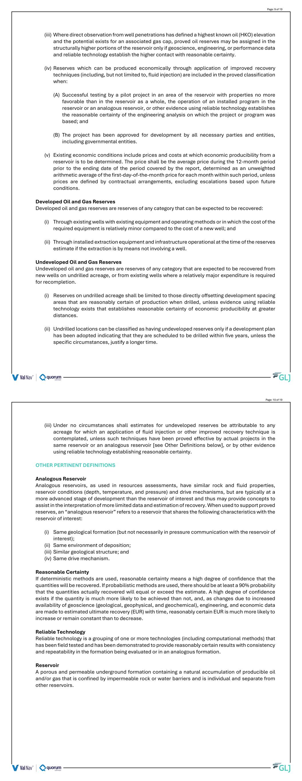 (iii) Where direct observation from well penetrations has defined a highest known oil (HKO) elevation and the potential exists for an associated gas cap, proved oil reserves may be assigned in the structurally higher portions of the reservoir only if geoscience, engineering, or performance data and reliable technology establish the higher contact with reasonable certainty. (iv) Reserves which can be produced economically through application of improved recovery techniques (including, but not limited to, fluid injection) are included in the proved classification when: (A) Successful testing by a pilot project in an area of the reservoir with properties no more favorable than in the reservoir as a whole, the operation of an installed program in the reservoir or an analogous reservoir, or other evidence using reliable technology establishes the reasonable certainty of the engineering analysis on which the project or program was based; and (B) The project has been approved for development by all necessary parties and entities, including governmental entities. (v) Existing economic conditions include prices and costs at which economic producibility from a reservoir is to be determined. The price shall be the average price during the 12-month period prior to the ending date of the period covered by the report, determined as an unweighted arithmetic average of the first-day-of-the-month price for each month within such period, unless prices are defined by contractual arrangements, excluding escalations based upon future conditions. Developed Oil and Gas Reserves Developed oil and gas reserves are reserves of any category that can be expected to be recovered: (i) Through existing wells with existing equipment and operating methods or in which the cost of the required equipment is relatively minor compared to the cost of a new well; and (ii) Through installed extraction equipment and infrastructure operational at the time of the reserves estimate if the extraction is by means not involving a well. Undeveloped Oil and Gas Reserves Undeveloped oil and gas reserves are reserves of any category that are expected to be recovered from new wells on undrilled acreage, or from existing wells where a relatively major expenditure is required for recompletion. (i) Reserves on undrilled acreage shall be limited to those directly offsetting development spacing areas that are reasonably certain of production when drilled, unless evidence using reliable technology exists that establishes reasonable certainty of economic producibility at greater distances. (ii) Undrilled locations can be classified as having undeveloped reserves only if a development plan has been adopted indicating that they are scheduled to be drilled within five years, unless the specific circumstances, justify a longer time. Page: 9 of 19 (iii) Under no circumstances shall estimates for undeveloped reserves be attributable to any acreage for which an application of fluid injection or other improved recovery technique is contemplated, unless such techniques have been proved effective by actual projects in the same reservoir or an analogous reservoir [see Other Definitions below], or by other evidence using reliable technology establishing reasonable certainty. OTHER PERTINENT DEFINITIONS Analogous Reservoir Analogous reservoirs, as used in resources assessments, have similar rock and fluid properties, reservoir conditions (depth, temperature, and pressure) and drive mechanisms, but are typically at a more advanced stage of development than the reservoir of interest and thus may provide concepts to assist in the interpretation of more limited data and estimation of recovery. When used to support proved reserves, an “analogous reservoir” refers to a reservoir that shares the following characteristics with the reservoir of interest: (i) Same geological formation (but not necessarily in pressure communication with the reservoir of interest); (ii) Same environment of deposition; (iii) Similar geological structure; and (iv) Same drive mechanism. Reasonable Certainty If deterministic methods are used, reasonable certainty means a high degree of confidence that the quantities will be recovered. If probabilistic methods are used, there should be at least a 90% probability that the quantities actually recovered will equal or exceed the estimate. A high degree of confidence exists if the quantity is much more likely to be achieved than not, and, as changes due to increased availability of geoscience (geological, geophysical, and geochemical), engineering, and economic data are made to estimated ultimate recovery (EUR) with time, reasonably certain EUR is much more likely to increase or remain constant than to decrease. Reliable Technology Reliable technology is a grouping of one or more technologies (including computational methods) that has been field tested and has been demonstrated to provide reasonably certain results with consistency and repeatability in the formation being evaluated or in an analogous formation. Reservoir A porous and permeable underground formation containing a natural accumulation of producible oil and/or gas that is confined by impermeable rock or water barriers and is individual and separate from other reservoirs. Page: 10 of 19