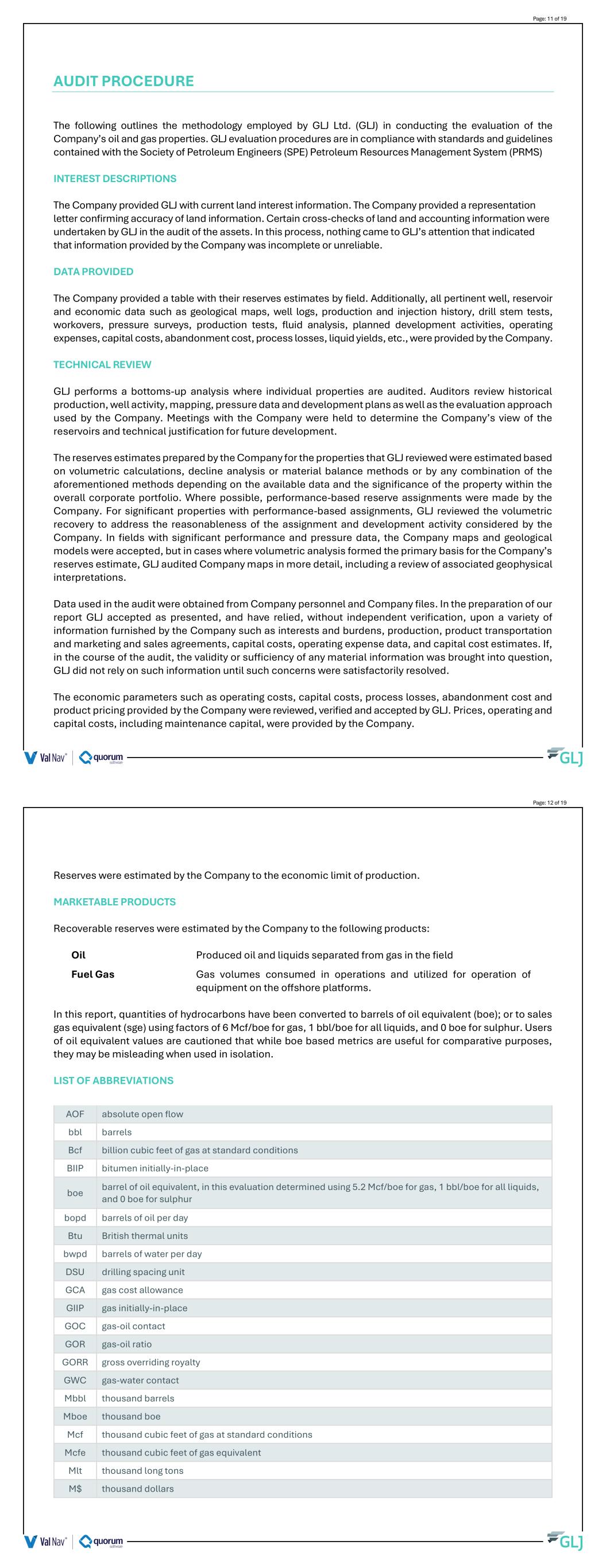AUDIT PROCEDURE The following outlines the methodology employed by GLJ Ltd. (GLJ) in conducting the evaluation of the Company’s oil and gas properties. GLJ evaluation procedures are in compliance with standards and guidelines contained with the Society of Petroleum Engineers (SPE) Petroleum Resources Management System (PRMS) INTEREST DESCRIPTIONS The Company provided GLJ with current land interest information. The Company provided a representation letter confirming accuracy of land information. Certain cross-checks of land and accounting information were undertaken by GLJ in the audit of the assets. In this process, nothing came to GLJ’s attention that indicated that information provided by the Company was incomplete or unreliable. DATA PROVIDED The Company provided a table with their reserves estimates by field. Additionally, all pertinent well, reservoir and economic data such as geological maps, well logs, production and injection history, drill stem tests, workovers, pressure surveys, production tests, fluid analysis, planned development activities, operating expenses, capital costs, abandonment cost, process losses, liquid yields, etc., were provided by the Company. TECHNICAL REVIEW GLJ performs a bottoms-up analysis where individual properties are audited. Auditors review historical production, well activity, mapping, pressure data and development plans as well as the evaluation approach used by the Company. Meetings with the Company were held to determine the Company’s view of the reservoirs and technical justification for future development. The reserves estimates prepared by the Company for the properties that GLJ reviewed were estimated based on volumetric calculations, decline analysis or material balance methods or by any combination of the aforementioned methods depending on the available data and the significance of the property within the overall corporate portfolio. Where possible, performance-based reserve assignments were made by the Company. For significant properties with performance-based assignments, GLJ reviewed the volumetric recovery to address the reasonableness of the assignment and development activity considered by the Company. In fields with significant performance and pressure data, the Company maps and geological models were accepted, but in cases where volumetric analysis formed the primary basis for the Company’s reserves estimate, GLJ audited Company maps in more detail, including a review of associated geophysical interpretations. Data used in the audit were obtained from Company personnel and Company files. In the preparation of our report GLJ accepted as presented, and have relied, without independent verification, upon a variety of information furnished by the Company such as interests and burdens, production, product transportation and marketing and sales agreements, capital costs, operating expense data, and capital cost estimates. If, in the course of the audit, the validity or sufficiency of any material information was brought into question, GLJ did not rely on such information until such concerns were satisfactorily resolved. The economic parameters such as operating costs, capital costs, process losses, abandonment cost and product pricing provided by the Company were reviewed, verified and accepted by GLJ. Prices, operating and capital costs, including maintenance capital, were provided by the Company. Page: 11 of 19 Reserves were estimated by the Company to the economic limit of production. MARKETABLE PRODUCTS Recoverable reserves were estimated by the Company to the following products: Oil Produced oil and liquids separated from gas in the field Fuel Gas Gas volumes consumed in operations and utilized for operation of equipment on the offshore platforms. In this report, quantities of hydrocarbons have been converted to barrels of oil equivalent (boe); or to sales gas equivalent (sge) using factors of 6 Mcf/boe for gas, 1 bbl/boe for all liquids, and 0 boe for sulphur. Users of oil equivalent values are cautioned that while boe based metrics are useful for comparative purposes, they may be misleading when used in isolation. LIST OF ABBREVIATIONS AOF absolute open flow bbl barrels Bcf billion cubic feet of gas at standard conditions BIIP bitumen initially-in-place boe barrel of oil equivalent, in this evaluation determined using 5.2 Mcf/boe for gas, 1 bbl/boe for all liquids, and 0 boe for sulphur bopd barrels of oil per day Btu British thermal units bwpd barrels of water per day DSU drilling spacing unit GCA gas cost allowance GIIP gas initially-in-place GOC gas-oil contact GOR gas-oil ratio GORR gross overriding royalty GWC gas-water contact Mbbl thousand barrels Mboe thousand boe Mcf thousand cubic feet of gas at standard conditions Mcfe thousand cubic feet of gas equivalent Mlt thousand long tons M$ thousand dollars Page: 12 of 19
