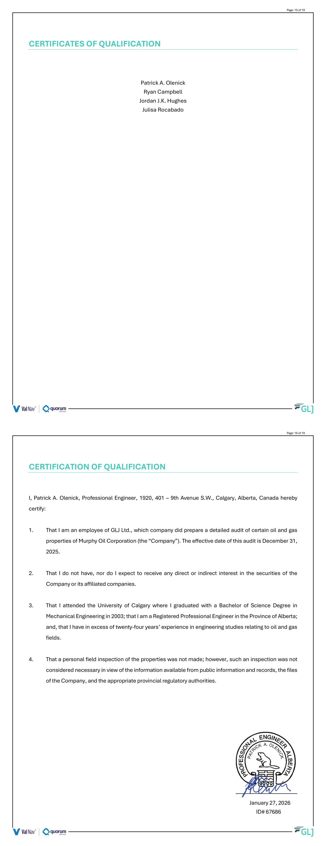 CERTIFICATES OF QUALIFICATION Patrick A. Olenick Ryan Campbell Jordan J.K. Hughes Julisa Rocabado Page: 15 of 19 CERTIFICATION OF QUALIFICATION I, Patrick A. Olenick, Professional Engineer, 1920, 401 – 9th Avenue S.W., Calgary, Alberta, Canada hereby certify: 1. That I am an employee of GLJ Ltd., which company did prepare a detailed audit of certain oil and gas properties of Murphy Oil Corporation (the “Company”). The effective date of this audit is December 31, 2025. 2. That I do not have, nor do I expect to receive any direct or indirect interest in the securities of the Company or its affiliated companies. 3. That I attended the University of Calgary where I graduated with a Bachelor of Science Degree in Mechanical Engineering in 2003; that I am a Registered Professional Engineer in the Province of Alberta; and, that I have in excess of twenty-four years’ experience in engineering studies relating to oil and gas fields. 4. That a personal field inspection of the properties was not made; however, such an inspection was not considered necessary in view of the information available from public information and records, the files of the Company, and the appropriate provincial regulatory authorities. January 27, 2026 ID# 67686 Page: 16 of 19