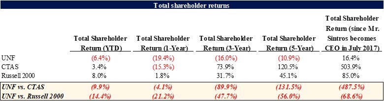 Since the passing of former CEO Ronald Croatti in May 2017, we believe UniFirst, a once-thriving company with a strong culture, has stagnated and consistently surrendered market share. In a surprising departure from Mr. Ronald Croatti’s expressed succession plans, his son Michael A. Croatti was not appointed CEO despite his 28 years at the Company; instead, the former CFO, Steven Sintros, was elevated to President and CEO, and Cynthia Croatti later assumed the role of Special Consultant and Advisor to the CEO and Senior Leadership. We believe these decisions marked the beginning of UniFirst’s decline.