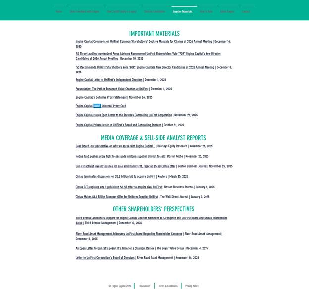 Item 2: Also, on December 16, 2025, Engine posted the following materials and updates to www.SaveUniFirst.com:
