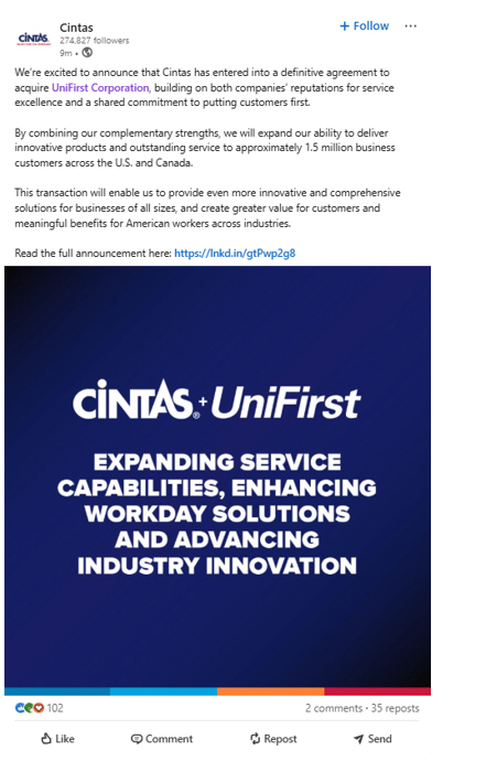 This communication contains forward-looking statements within the meaning of Section 21E of the Securities Exchange Act of 1934, as amended, and Section 27A of the Securities Act of 1933, as amended (the “Securities Act of 1933”), which involve risks and uncertainties. Any statements about Cintas’, UniFirst’s or the combined company’s plans, objectives, expectations, strategies, beliefs, or future performance or events and any other statements to the extent they are not statements of historical fact are forward-looking statements. Words, phrases or expressions such as “estimates,” “confident,” “continue,” “hope,” “likely,” “might,” “possible,” “potential,” “trend,” “anticipates,” “predicts,” “projects,” “plans,” “expects,” “intends,” “targets,” “forecasts,” “believes,” “seeks,” “could,” “should,” “may,” “will,” “strategy,” “objective,” and similar words, phrases or expressions or the negative versions thereof are intended to identify forward-looking statements but are not the exclusive means of identifying such statements. Forward-looking statements are based on information available and assumptions made at the time the statements are made. Forward-looking statements involve risks and uncertainties that could cause actual results to differ materially from those expressed in or implied by the forward-looking statements. Forward-looking statements in this communication include, but are not limited to, statements about the benefits of the transaction between Cintas and UniFirst (the “Transaction”), including future financial and operating results, the combined company’s plans, objectives, expectations and intentions, and other statements that are not historical facts.