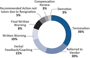 As indicated above, in an effort to provide complete information, the 2022 data includes all types of harassment, discrimination, and retaliation concerns. During 2022, 100% of substantiated concerns involving employee respondents resulted in corrective action, ranging from verbal feedback or coaching (15% of all corrective actions) to termination (36% of all corrective actions). Specifically, the 36 total substantiated cases reported above involved 37 respondents and 39 corrective actions21. The type of conduct that resulted in termination included inappropriate or discriminatory language, messages, or behavior (9 cases), discriminatory exclusion from chat room (1 case), physical assault (4 cases), non-consensual touching (2 cases), unwanted advances (4 cases), misgendering22 and the use of inappropriate language (1 case) and retaliation (1 case). Written warnings were given when the conduct was less severe, or where the laws of a particular jurisdiction restrict the ability to terminate. The type of conduct that resulted in a written warning included inappropriate or discriminatory language or behavior (7 cases). Verbal feedback