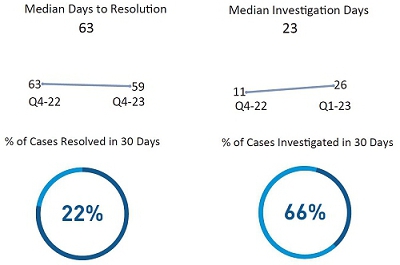 For concerns relating to harassment, discrimination, or retaliation that were submitted in Q4 2022 and Q1 2023, the median time to investigate was 23 days. Further, 66% of cases within those periods were fully investigated within 30 days. As of March 31, 2023, investigations were pending for 26 concerns relating to harassment, discrimination, or retaliation, across all protected characteristics.