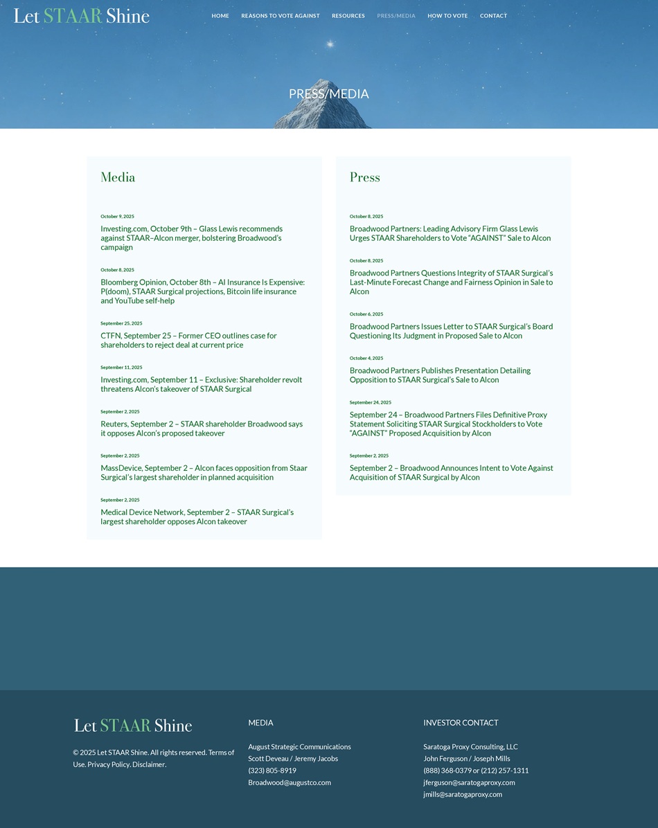 PRESS/MEDIA Media October 9 , 2025 Investing . com, October 9 th – Glass Lewis recommends against STAAR – Alcon merger, bolstering Broadwood’s campaign October 8, 2025 Bloomberg Opinion, October 8th – AI Insurance Is Expensive: P(doom), STAAR Surgical projections, Bitcoin life insurance and YouTube self - help September 25, 2025 CTFN, September 25 – Former CEO outlines case for shareholders to reject deal at current price September 11, 2025 Investing.com, September 11 – Exclusive: Shareholder revolt threatens Alcon’s takeover of STAAR Surgical September 2, 2025 Reuters, September 2 – STAAR shareholder Broadwood says it opposes Alcon’s proposed takeover September 2, 2025 MassDevice, September 2 – Alcon faces opposition from Staar Surgical’s largest shareholder in planned acquisition September 2, 2025 Medical Device Network, September 2 – STAAR Surgical’s largest shareholder opposes Alcon takeover Press October 8, 2025 Broadwood Partners: Leading Advisory Firm Glass Lewis Urges STAAR Shareholders to Vote “AGAINST” Sale to Alcon October 8, 2025 Broadwood Partners Questions Integrity of STAAR Surgical’s Last - Minute Forecast Change and Fairness Opinion in Sale to Alcon October 6, 2025 Broadwood Partners Issues Letter to STAAR Surgical’s Board Questioning Its Judgment in Proposed Sale to Alcon October 4, 2025 Broadwood Partners Publishes Presentation Detailing Opposition to STAAR Surgical’s Sale to Alcon September 24, 2025 September 24 – Broadwood Partners Files Definitive Proxy Statement Soliciting STAAR Surgical Stockholders to Vote “AGAINST” Proposed Acquisition by Alcon September 2, 2025 September 2 – Broadwood Announces Intent to Vote Against Acquisition of STAAR Surgical by Alcon © 2025 Let STAAR Shine. All rights reserved. Terms of Use. Privacy Policy. Disclaimer. MEDIA August Strategic Communications Scott Deveau / Jeremy Jacobs (323) 805 - 8919 Broadwood@augustco.com INVESTOR CONTACT Saratoga Proxy Consulting, LLC John Ferguson / Joseph Mills (888) 368 - 0379 or (212) 257 - 1311 jferguson@saratogaproxy.com jmills@saratogaproxy.com HOME REASONS TO VOTE AGAINST RESOURCES PRESS/MEDIA HOW TO VOTE CONTACT