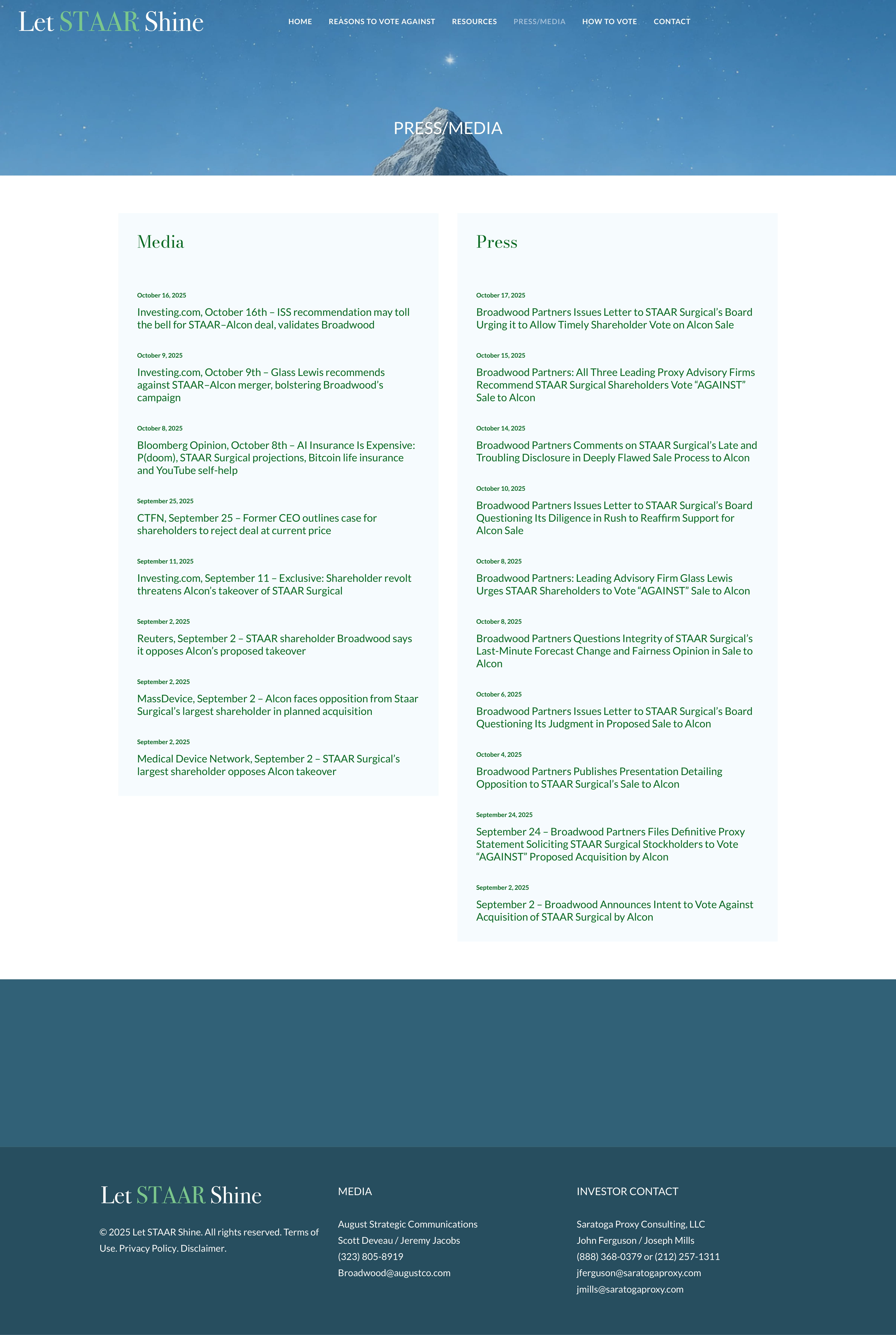 PRESS/MEDIA Media October 16, 2025 Investing.com, October 16th – ISS recommendation may toll the bell for STAAR – Alcon deal, validates Broadwood October 9, 2025 Investing.com, October 9th – Glass Lewis recommends against STAAR – Alcon merger, bolstering Broadwood’s campaign October 8, 2025 Bloomberg Opinion, October 8th – AI Insurance Is Expensive: P(doom), STAAR Surgical projections, Bitcoin life insurance and YouTube self - help September 25, 2025 CTFN, September 25 – Former CEO outlines case for shareholders to reject deal at current price September 11, 2025 Investing.com, September 11 – Exclusive: Shareholder revolt threatens Alcon’s takeover of STAAR Surgical September 2, 2025 Reuters, September 2 – STAAR shareholder Broadwood says it opposes Alcon’s proposed takeover September 2, 2025 MassDevice, September 2 – Alcon faces opposition from Staar Surgical’s largest shareholder in planned acquisition September 2, 2025 Medical Device Network, September 2 – STAAR Surgical’s largest shareholder opposes Alcon takeover Press October 17, 2025 Broadwood Partners Issues Letter to STAAR Surgical’s Board Urging it to Allow Timely Shareholder Vote on Alcon Sale October 15, 2025 Broadwood Partners: All Three Leading Proxy Advisory Firms Recommend STAAR Surgical Shareholders Vote “AGAINST” Sale to Alcon October 14, 2025 Broadwood Partners Comments on STAAR Surgical’s Late and Troubling Disclosure in Deeply Flawed Sale Process to Alcon October 10, 2025 Broadwood Partners Issues Letter to STAAR Surgical’s Board Questioning Its Diligence in Rush to Reaffirm Support for Alcon Sale October 8, 2025 Broadwood Partners: Leading Advisory Firm Glass Lewis Urges STAAR Shareholders to Vote “AGAINST” Sale to Alcon October 8, 2025 Broadwood Partners Questions Integrity of STAAR Surgical’s Last - Minute Forecast Change and Fairness Opinion in Sale to Alcon October 6, 2025 Broadwood Partners Issues Letter to STAAR Surgical’s Board Questioning Its Judgment in Proposed Sale to Alcon October 4, 2025 Broadwood Partners Publishes Presentation Detailing Opposition to STAAR Surgical’s Sale to Alcon September 24, 2025 September 24 – Broadwood Partners Files Definitive Proxy Statement Soliciting STAAR Surgical Stockholders to Vote “AGAINST” Proposed Acquisition by Alcon September 2, 2025 September 2 – Broadwood Announces Intent to Vote Against Acquisition of STAAR Surgical by Alcon © 2025 Let STAAR Shine. All rights reserved. Terms of Use. Privacy Policy. Disclaimer. MEDIA August Strategic Communications Scott Deveau / Jeremy Jacobs (323) 805 - 8919 Broadwood@augustco.com INVESTOR CONTACT Saratoga Proxy Consulting, LLC John Ferguson / Joseph Mills (888) 368 - 0379 or (212) 257 - 1311 jferguson@saratogaproxy.com jmills@saratogaproxy.com HOME REASONS TO VOTE AGAINST RESOURCES PRESS/MEDIA HOW TO VOTE CONTACT
