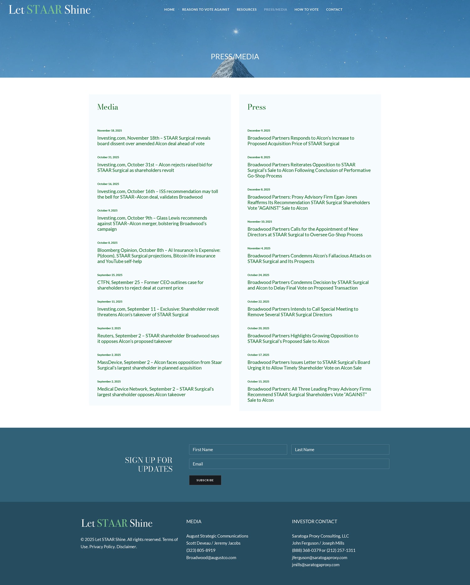 PRESS/MEDIA Media November 18, 2025 Investing.com, November 18th – STAAR Surgical reveals board dissent over amended Alcon deal ahead of vote October 31, 2025 Investing.com, October 31st – Alcon rejects raised bid for STAAR Surgical as shareholders revolt October 16, 2025 Investing.com, October 16th – ISS recommendation may toll the bell for STAAR – Alcon deal, validates Broadwood October 9, 2025 Investing . com, October 9 th – Glass Lewis recommends against STAAR – Alcon merger, bolstering Broadwood’s campaign October 8, 2025 Bloomberg Opinion, October 8th – AI Insurance Is Expensive: P(doom), STAAR Surgical projections, Bitcoin life insurance and YouTube self - help September 25, 2025 CTFN, September 25 – Former CEO outlines case for shareholders to reject deal at current price September 11, 2025 Investing.com, September 11 – Exclusive: Shareholder revolt threatens Alcon’s takeover of STAAR Surgical September 2, 2025 Reuters, September 2 – STAAR shareholder Broadwood says it opposes Alcon’s proposed takeover September 2, 2025 MassDevice, September 2 – Alcon faces opposition from Staar Surgical’s largest shareholder in planned acquisition September 2, 2025 Medical Device Network, September 2 – STAAR Surgical’s largest shareholder opposes Alcon takeover Press December 9, 2025 Broadwood Partners Responds to Alcon’s Increase to Proposed Acquisition Price of STAAR Surgical December 8, 2025 Broadwood Partners Reiterates Opposition to STAAR Surgical’s Sale to Alcon Following Conclusion of Performative Go - Shop Process December 8, 2025 Broadwood Partners: Proxy Advisory Firm Egan - Jones Reaffirms Its Recommendation STAAR Surgical Shareholders Vote “AGAINST” Sale to Alcon November 10, 2025 Broadwood Partners Calls for the Appointment of New Directors at STAAR Surgical to Oversee Go - Shop Process November 4, 2025 Broadwood Partners Condemns Alcon’s Fallacious Attacks on STAAR Surgical and Its Prospects October 24, 2025 Broadwood Partners Condemns Decision by STAAR Surgical and Alcon to Delay Final Vote on Proposed Transaction October 22, 2025 Broadwood Partners Intends to Call Special Meeting to Remove Several STAAR Surgical Directors October 20, 2025 Broadwood Partners Highlights Growing Opposition to STAAR Surgical’s Proposed Sale to Alcon October 17, 2025 Broadwood Partners Issues Letter to STAAR Surgical’s Board Urging it to Allow Timely Shareholder Vote on Alcon Sale October 15, 2025 Broadwood Partners: All Three Leading Proxy Advisory Firms Recommend STAAR Surgical Shareholders Vote “AGAINST” Sale to Alcon SIGN UP FOR UPDATES SUBSCRIBE First Name Last Name Email © 2025 Let STAAR Shine. All rights reserved. Terms of Use. Privacy Policy. Disclaimer. MEDIA August Strategic Communications Scott Deveau / Jeremy Jacobs (323) 805 - 8919 Broadwood@augustco.com INVESTOR CONTACT Saratoga Proxy Consulting, LLC John Ferguson / Joseph Mills (888) 368 - 0379 or (212) 257 - 1311 jferguson@saratogaproxy.com jmills@saratogaproxy.com HOME REASONS TO VOTE AGAINST RESOURCES PRESS/MEDIA HOW TO VOTE CONTACT