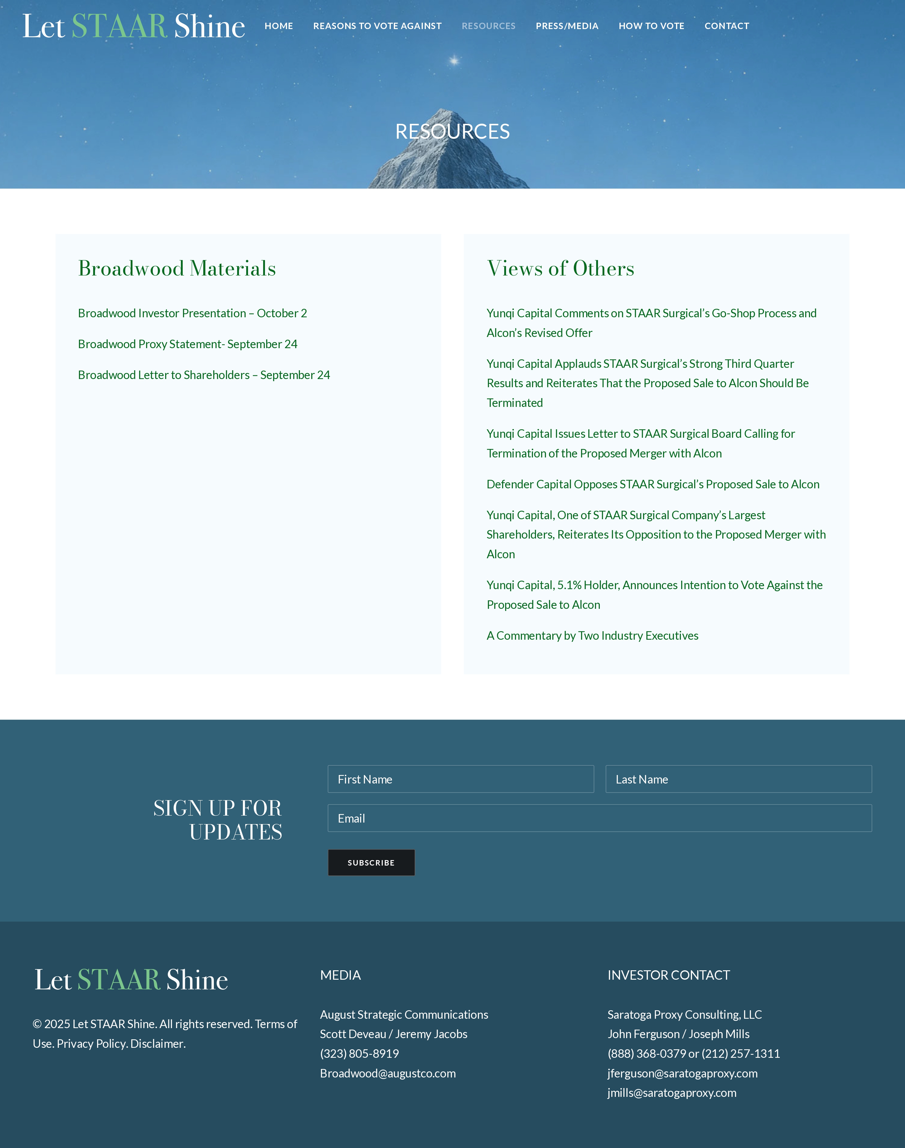 RESOURCES Broadwood Materials Broadwood Investor Presentation – October 2 Broadwood Proxy Statement - September 24 Broadwood Letter to Shareholders – September 24 Views of Others Yunqi Capital Comments on STAAR Surgical’s Go - Shop Process and Alcon’s Revised Offer Yunqi Capital Applauds STAAR Surgical’s Strong Third Quarter Results and Reiterates That the Proposed Sale to Alcon Should Be Terminated Yunqi Capital Issues Letter to STAAR Surgical Board Calling for Termination of the Proposed Merger with Alcon Defender Capital Opposes STAAR Surgical’s Proposed Sale to Alcon Yunqi Capital, One of STAAR Surgical Company’s Largest Shareholders, Reiterates Its Opposition to the Proposed Merger with Alcon Yunqi Capital, 5.1% Holder, Announces Intention to Vote Against the Proposed Sale to Alcon A Commentary by Two Industry Executives SIGN UP FOR UPDATES SUBSCRIBE First Name Last Name Email © 2025 Let STAAR Shine. All rights reserved. Terms of Use. Privacy Policy. Disclaimer. MEDIA August Strategic Communications Scott Deveau / Jeremy Jacobs (323) 805 - 8919 Broadwood@augustco.com INVESTOR CONTACT Saratoga Proxy Consulting, LLC John Ferguson / Joseph Mills (888) 368 - 0379 or (212) 257 - 1311 jferguson@saratogaproxy.com jmills@saratogaproxy.com HOME REASONS TO VOTE AGAINST RESOURCES PRESS/MEDIA HOW TO VOTE CONTACT