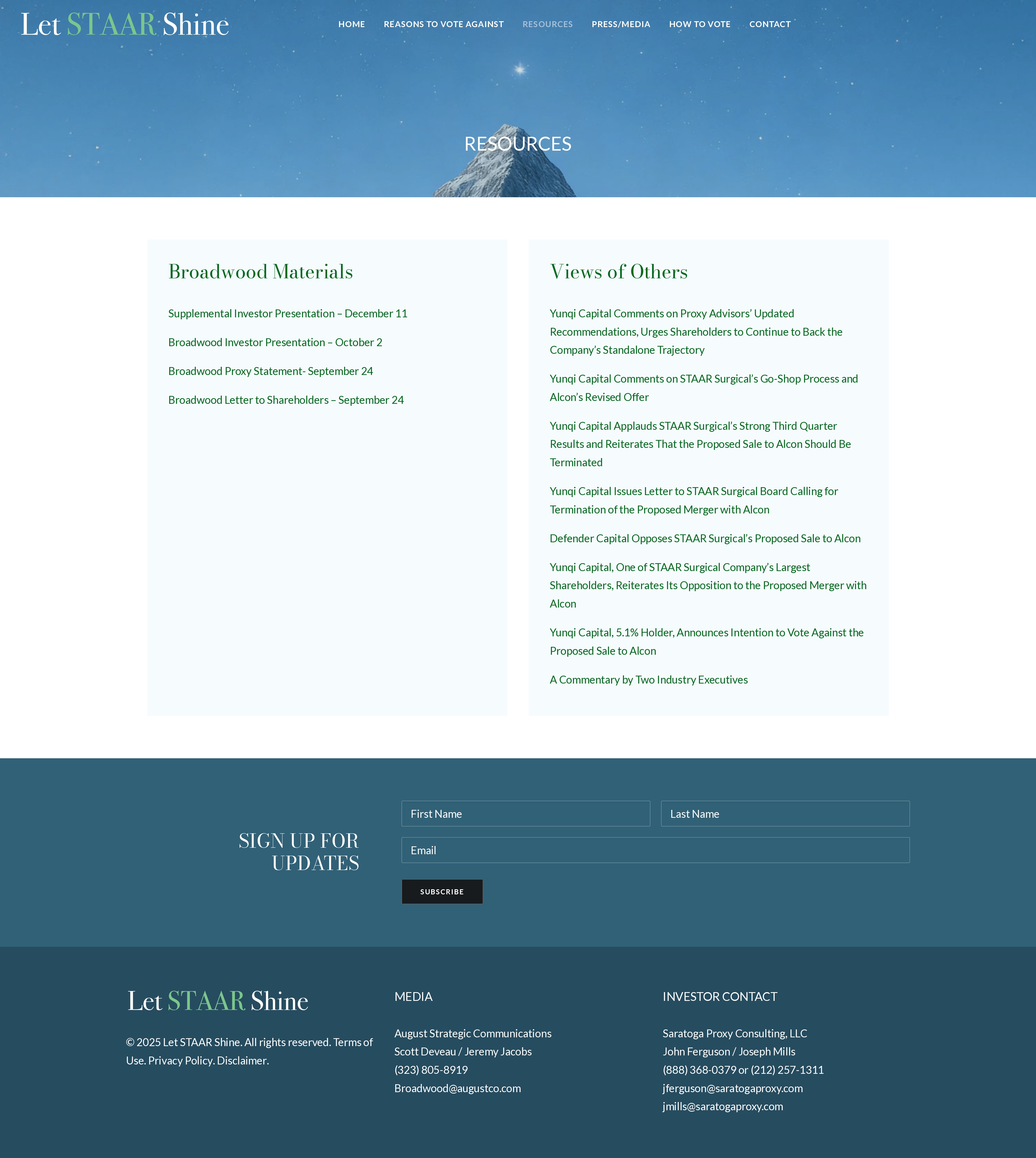 “The proposed sale to Alcon has been met with overwhelming opposition from STAAR shareholders, proxy advisory firms, and even from within STAAR’s own boardroom. We reject ISS’s inexplicable decision to offer ‘cautionary support’ for the proposed transaction in the face of what ISS itself described as uncured process concerns, skepticism that Alcon’s revised offer represents full value for STAAR, and an inability of shareholders to rely on STAAR’s Board and management team. ISS’s condemnation of the integrity of the Board and management team reinforces our strong belief that this transaction should be voted down and followed by significant changes to STAAR’s leadership group.