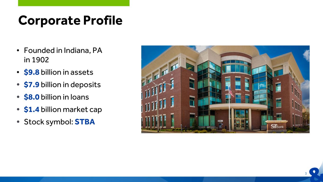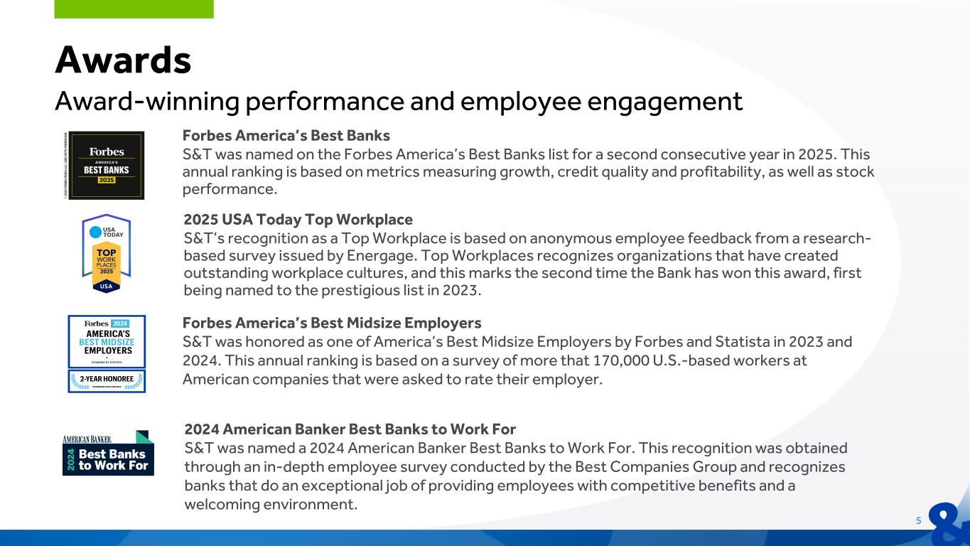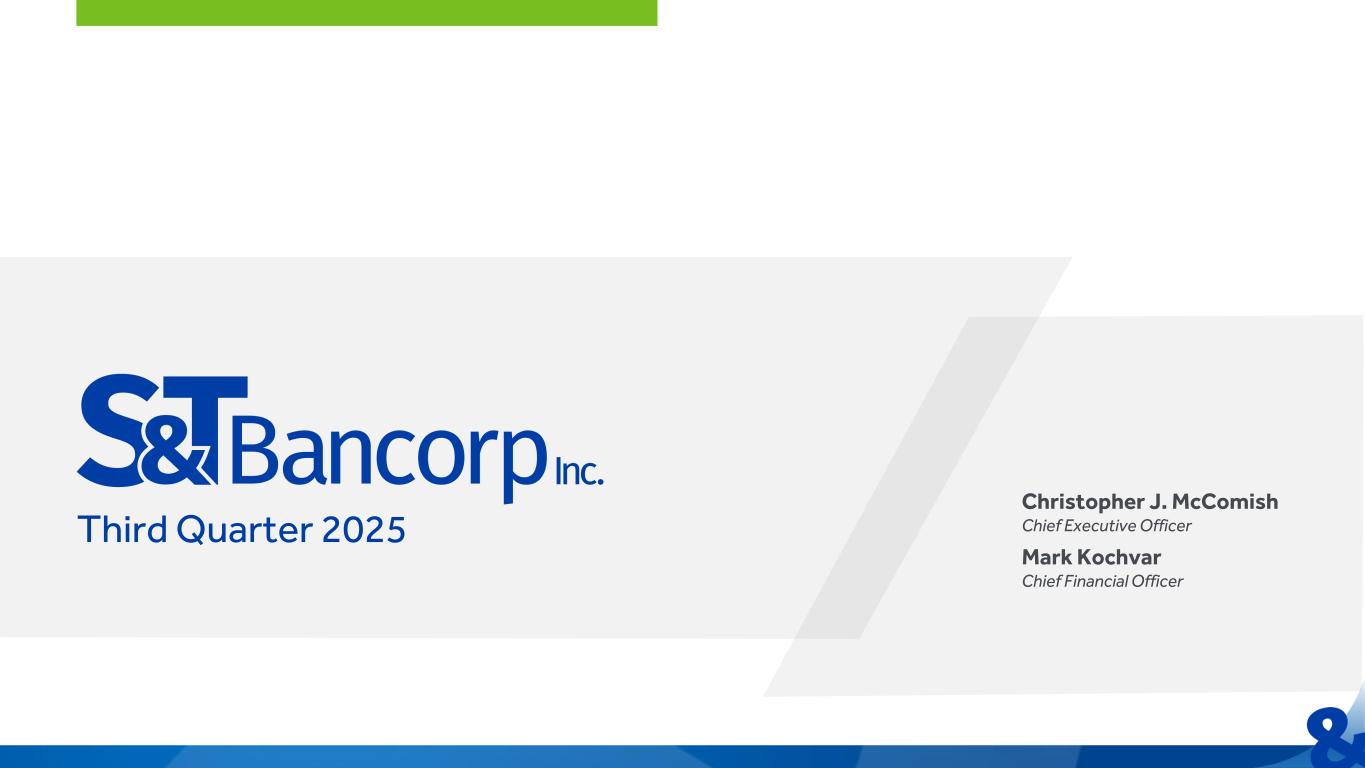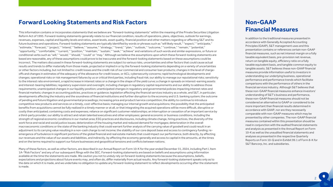 Forward Looking Statements and Risk Factors This information contains or incorporates statements that we believe are “forward-looking statements” within the meaning of the Private Securities Litigation Reform Act of 1995. Forward-looking statements generally relate to our financial condition, results of operations, plans, objectives, outlook for earnings, revenues, expenses, capital and liquidity levels and ratios, asset levels, asset quality, financial position and other matters regarding or affecting S&T and its future business and operations. Forward-looking statements are typically identified by words or phrases such as “will likely result,” “expect,” “anticipate,” “estimate,” “forecast,” “project,” “intend,” “believe,” “assume,” “strategy,” “trend,” “plan,” “outlook,” “outcome,” “continue,” “remain,” “potential,” “opportunity,” “comfortable,” “current,” “position,” “maintain,” “sustain,” “seek,” “achieve” and variations of such words and similar expressions, or future or conditional verbs such as “will,” “would,” “should,” “could” or “may.” Although we believe the assumptions upon which these forward-looking statements are based are reasonable, any of these assumptions could prove to be inaccurate and the forward-looking statements based on these assumptions could be incorrect. The matters discussed in these forward-looking statements are subject to various risks, uncertainties and other factors that could cause actual results and trends to differ materially from those made, projected or implied in or by the forward-looking statements depending on a variety of uncertainties or other factors including, but not limited to: credit losses and the credit risk of our commercial and consumer loan products; changes in the level of charge- offs and changes in estimates of the adequacy of the allowance for credit losses, or ACL; cybersecurity concerns; rapid technological developments and changes; operational risks or risk management failures by us or critical third parties, including fraud risk; our ability to manage our reputational risks; sensitivity to the interest rate environment, a rapid increase in interest rates or a change in the shape of the yield curve; a change in spreads on interest-earning assets and interest-bearing liabilities; regulatory supervision and oversight, including changes in regulatory capital requirements and our ability to address those requirements; unanticipated changes in our liquidity position; unanticipated changes in regulatory and governmental policies impacting interest rates and financial markets; changes in accounting policies, practices or guidance; legislation affecting the financial services industry as a whole, and S&T, in particular; developments affecting the industry and the soundness of financial institutions and further disruption to the economy and U.S. banking system; the outcome of pending and future litigation and governmental proceedings; increasing price and product/service competition; the ability to continue to introduce competitive new products and services on a timely, cost-effective basis; managing our internal growth and acquisitions; the possibility that the anticipated benefits from acquisitions cannot be fully realized in a timely manner or at all, or that integrating the acquired operations will be more difficult, disruptive or costly than anticipated; containing costs and expenses; reliance on significant customer relationships; an interruption or cessation of an important service by a third-party provider; our ability to attract and retain talented executives and other employees; general economic or business conditions, including the strength of regional economic conditions in our market area; ESG practices and disclosures, including climate change, hiring practices, the diversity of the work force and racial and social justice issues; deterioration of the housing market and reduced demand for mortgages; deterioration in the overall macroeconomic conditions or the state of the banking industry that could warrant further analysis of the carrying value of goodwill and could result in an adjustment to its carrying value resulting in a non-cash charge to net income; the stability of our core deposit base and access to contingency funding; re- emergence of turbulence in significant portions of the global financial and real estate markets that could impact our performance, both directly, by affecting our revenues and the value of our assets and liabilities, and indirectly, by affecting the economy generally and access to capital in the amounts, at the times and on the terms required to support our future businesses and geopolitical tensions and conflicts between nations. Many of these factors, as well as other factors, are described in our Annual Report on Form 10-K for the year ended December 31, 2024, including Part I, Item 1A-"Risk Factors" and any of our subsequent filings with the SEC. Forward-looking statements are based on beliefs and assumptions using information available at the time the statements are made. We caution you not to unduly rely on forward-looking statements because the assumptions, beliefs, expectations and projections about future events may, and often do, differ materially from actual results. Any forward-looking statement speaks only as to the date on which it is made, and we undertake no obligation to update any forward-looking statement to reflect developments occurring after the statement is made. Non-GAAP Financial Measures In addition to the traditional measures presented in accordance with Generally Accepted Accounting Principles (GAAP), S&T management uses and this presentation contains or references certain non-GAAP financial measures, such as net interest margin on a fully taxable equivalent basis, pre-provision net revenue, return on tangible equity, efficiency ratio on a ful