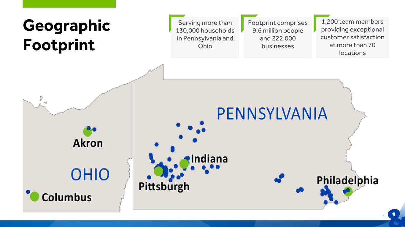 3 • Founded in Indiana, PA in 1902 • $9.8 billion in assets • $7.9 billion in deposits • $8.0 billion in loans • $1.4 billion market cap • Stock symbol: STBA Corporate Profile