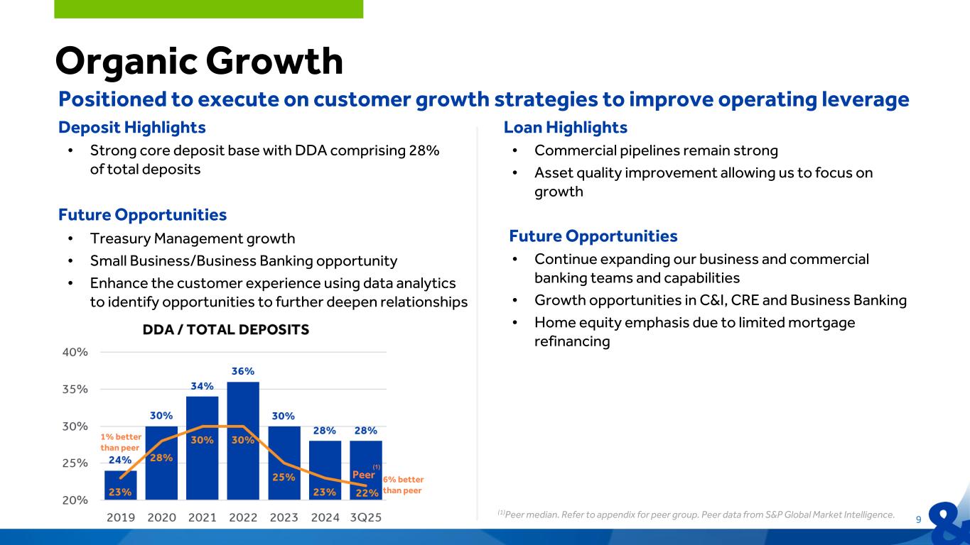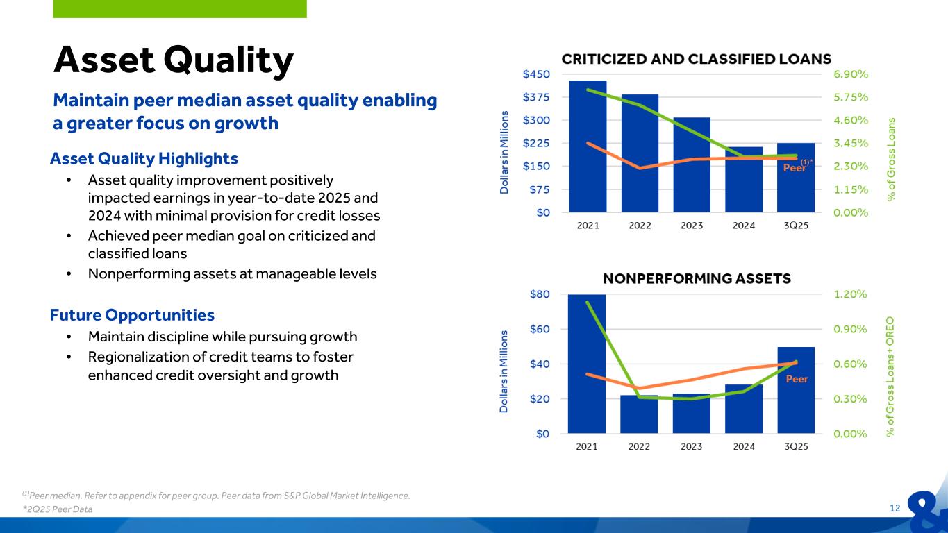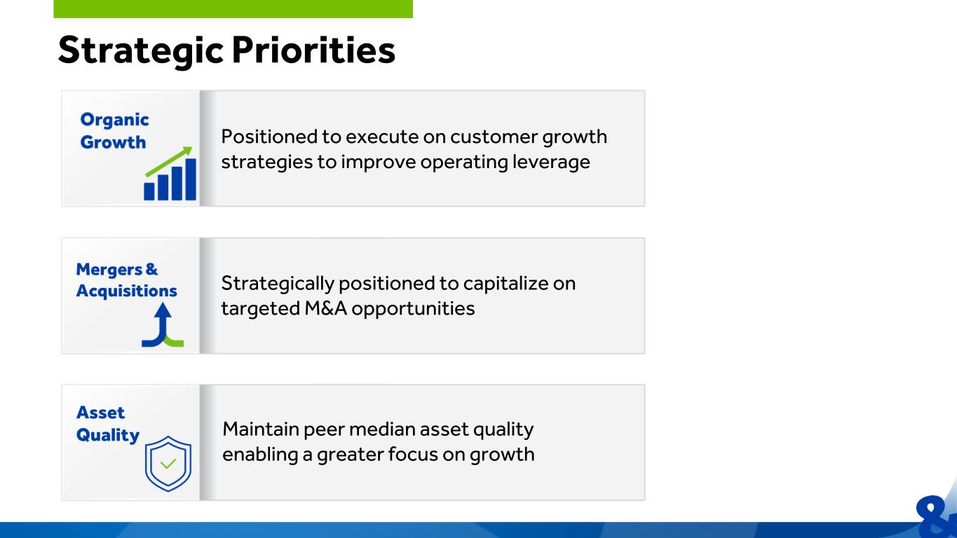 Strategic Priorities Positioned to execute on customer growth strategies to improve operating leverage Maintain peer median asset quality enabling a greater focus on growth Strategically positioned to capitalize on targeted M&A opportunities