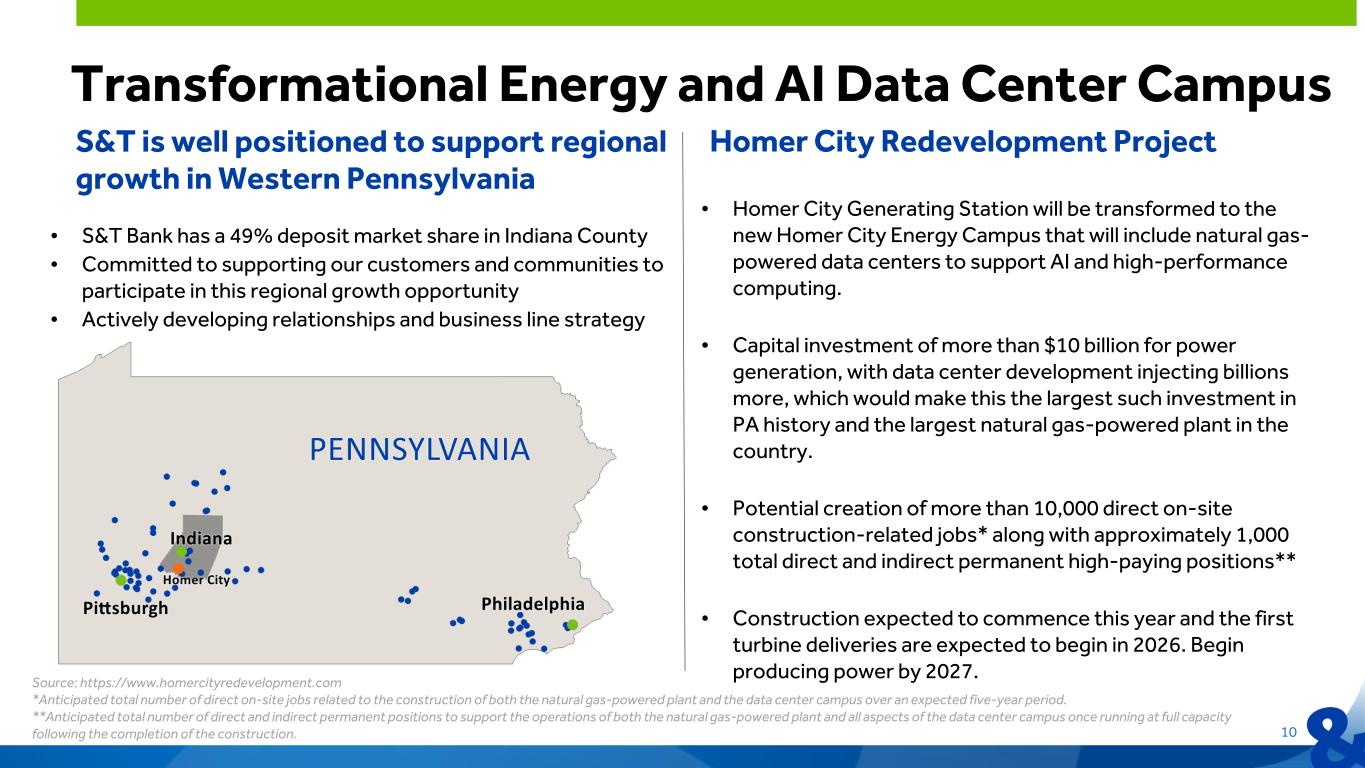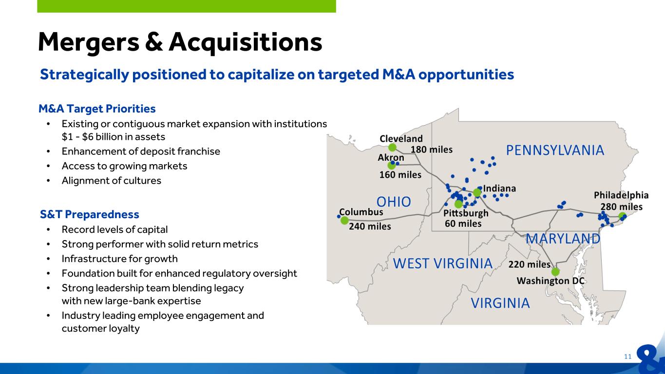 10 • Homer City Generating Station will be transformed to the new Homer City Energy Campus that will include natural gas- powered data centers to support AI and high-performance computing. • Capital investment of more than $10 billion for power generation, with data center development injecting billions more, which would make this the largest such investment in PA history and the largest natural gas-powered plant in the country. • Potential creation of more than 10,000 direct on-site construction-related jobs* along with approximately 1,000 total direct and indirect permanent high-paying positions** • Construction expected to commence this year and the first turbine deliveries are expected to begin in 2026. Begin producing power by 2027. Transformational Energy and AI Data Center Campus Homer City Redevelopment Project Source: https://www.homercityredevelopment.com *Anticipated total number of direct on-site jobs related to the construction of both the natural gas-powered plant and the data center campus over an expected five-year period. **Anticipated total number of direct and indirect permanent positions to support the operations of both the natural gas-powered plant and all aspects of the data center campus once running at full capacity following the completion of the construction. S&T is well positioned to support regional growth in Western Pennsylvania • S&T Bank has a 49% deposit market share in Indiana County • Committed to supporting our customers and communities to participate in this regional growth opportunity • Actively developing relationships and business line strategy