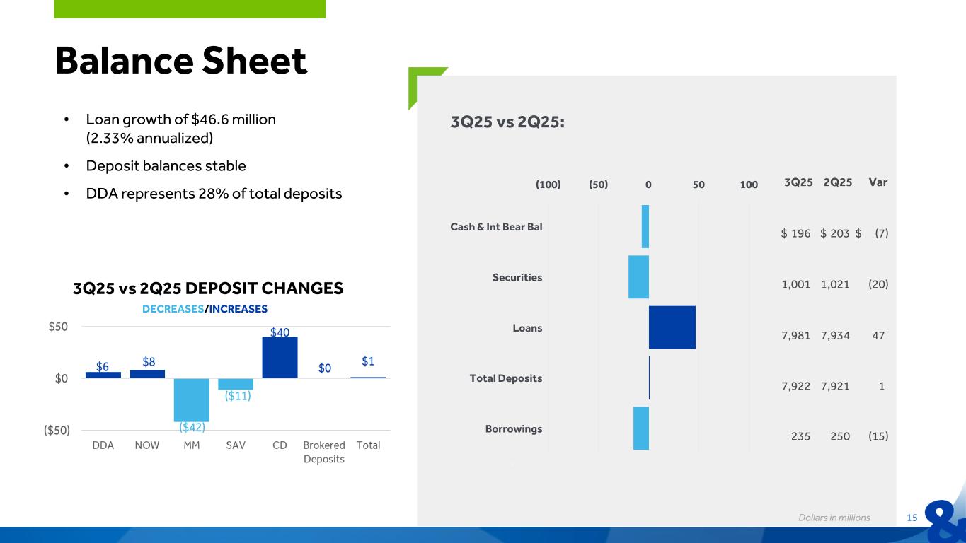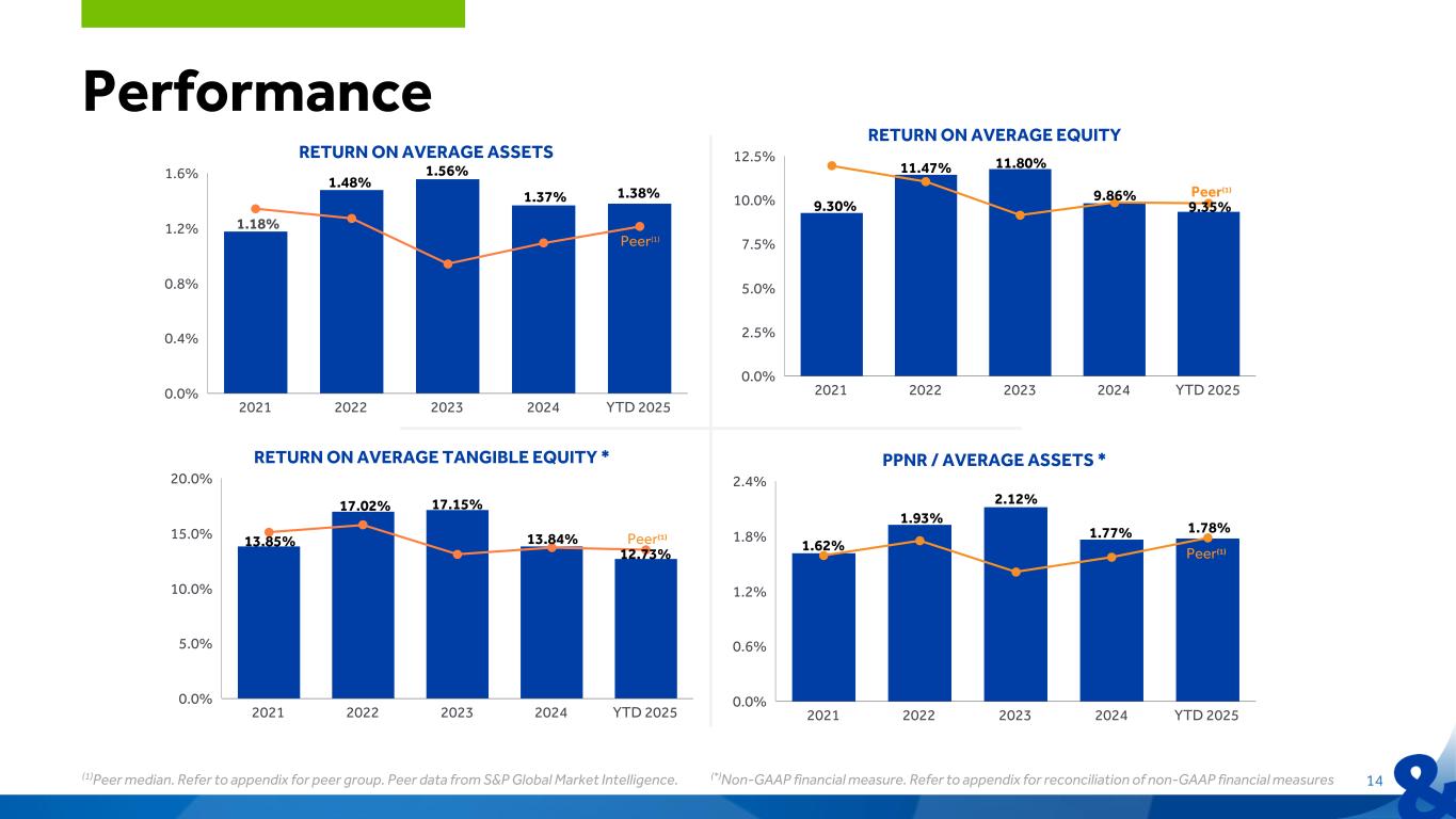 PPNR / AVERAGE ASSETS * 2021 2022 2023 2024 YTD 2025 0.0% 0.6% 1.2% 1.8% 2.4% RETURN ON AVERAGE TANGIBLE EQUITY * 2021 2022 2023 2024 YTD 2025 0.0% 5.0% 10.0% 15.0% 20.0% RETURN ON AVERAGE ASSETS 2021 2022 2023 2024 YTD 2025 0.0% 0.4% 0.8% 1.2% 1.6% RETURN ON AVERAGE EQUITY 2021 2022 2023 2024 YTD 2025 0.0% 2.5% 5.0% 7.5% 10.0% 12.5% Performance 14 1.48% 1.38% 11.47% 9.30% 9.86% 1.62% 2.12% 1.77% 17.02% 13.85% (1)Peer median. Refer to appendix for peer group. Peer data from S&P Global Market Intelligence. (*)Non-GAAP financial measure. Refer to appendix for reconciliation of non-GAAP financial measures 1.56% 11.80% 17.15% 1.93% 1.78% 9.35% 13.84% 12.73% Peer(1) Peer(1) Peer(1) Peer(1) 1.37% 1.18%
