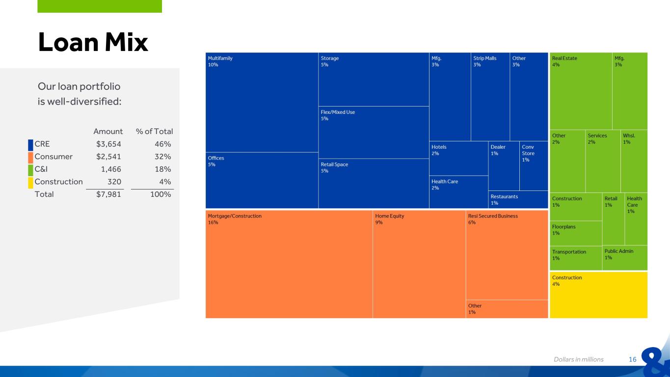 15 Balance Sheet • Loan growth of $46.6 million (2.33% annualized) • Deposit balances stable • DDA represents 28% of total deposits Dollars in millions 3Q25 2Q25 Var $ 196 $ 203 $ (7) 1,001 1,021 (20) 7,981 7,934 47 7,922 7,921 1 235 250 (15) (100) (50) 0 50 100 Cash & Int Bear Bal Securities Loans Total Deposits Borrowings 3Q25 vs 2Q25: 3Q25 vs 2Q25 DEPOSIT CHANGES DECREASES/INCREASES