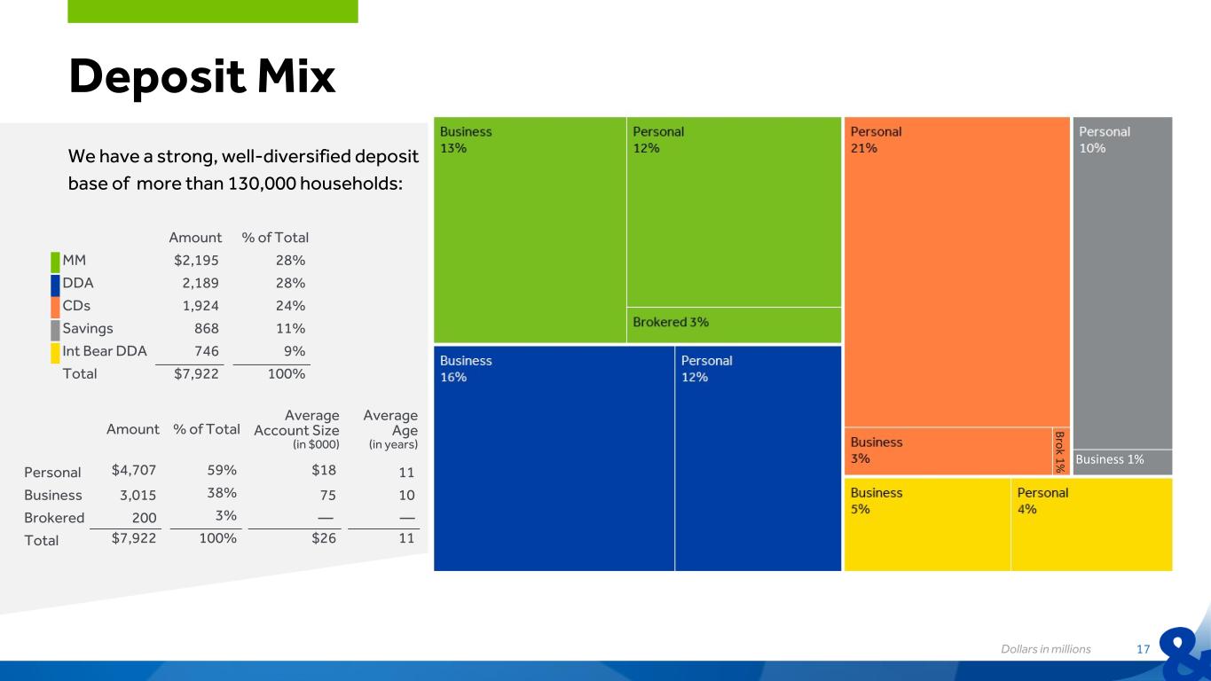Loan Mix Our loan portfolio is well-diversified: Dollars in millions 16 Amount % of Total CRE $3,654 46% Consumer $2,541 32% C&I 1,466 18% Construction 320 4% Total $7,981 100%