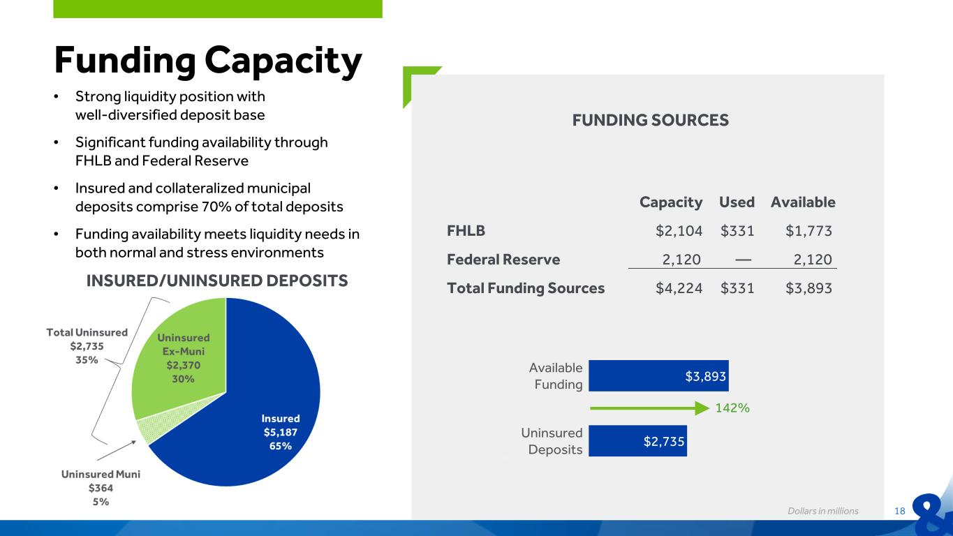 Deposit Mix We have a strong, well-diversified deposit base of more than 130,000 households: Dollars in millions 17 Amount % of Total MM $2,195 28% DDA 2,189 28% CDs 1,924 24% Savings 868 11% Int Bear DDA 746 9% Total $7,922 100% Amount % of Total Average Account Size (in $000) Average Age (in years) Personal $4,707 59% $18 11 Business 3,015 38% 75 10 Brokered 200 3% — — Total $7,922 100% $26 11 Business 1% Brok 1%