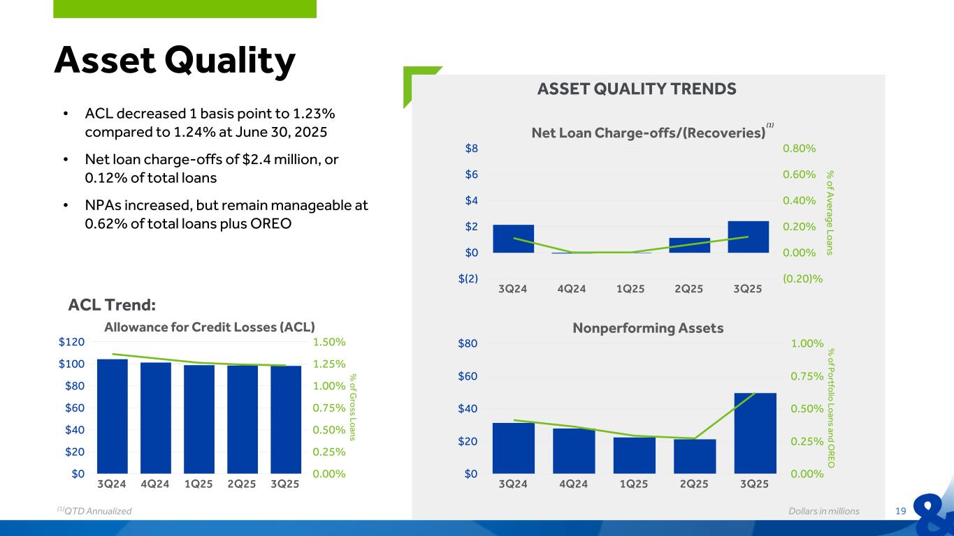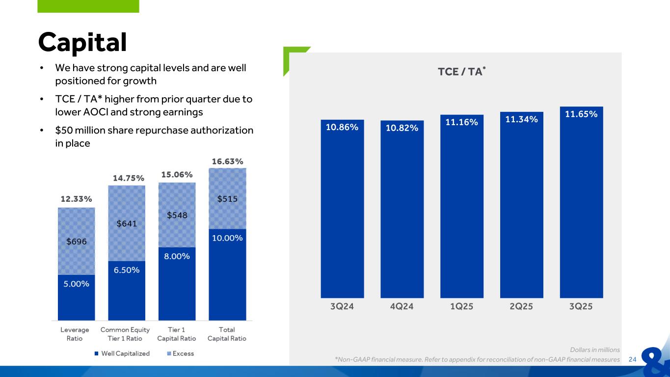 24 Capital Dollars in millions *Non-GAAP financial measure. Refer to appendix for reconciliation of non-GAAP financial measures TCE / TA*• We have strong capital levels and are well positioned for growth • TCE / TA* higher from prior quarter due to lower AOCI and strong earnings • $50 million share repurchase authorization in place 10.86% 10.82% 11.16% 11.34% 11.65% 3Q24 4Q24 1Q25 2Q25 3Q25