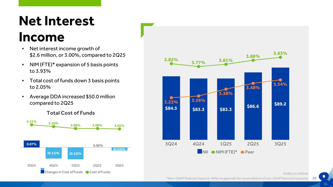 19 Asset Quality ACL Trend: Dollars in millions ASSET QUALITY TRENDS • ACL decreased 1 basis point to 1.23% compared to 1.24% at June 30, 2025 • Net loan charge-offs of $2.4 million, or 0.12% of total loans • NPAs increased, but remain manageable at 0.62% of total loans plus OREO % o f A verage Lo ans Net Loan Charge-offs/(Recoveries) 3Q24 4Q24 1Q25 2Q25 3Q25 $(2) $0 $2 $4 $6 $8 (0.20)% 0.00% 0.20% 0.40% 0.60% 0.80% % o f Po rtfo lio Lo ans and O R EO Nonperforming Assets 3Q24 4Q24 1Q25 2Q25 3Q25 $0 $20 $40 $60 $80 0.00% 0.25% 0.50% 0.75% 1.00% % o f G ro ss Lo ans Allowance for Credit Losses (ACL) 3Q24 4Q24 1Q25 2Q25 3Q25 $0 $20 $40 $60 $80 $100 $120 0.00% 0.25% 0.50% 0.75% 1.00% 1.25% 1.50% (1)QTD Annualized (1)