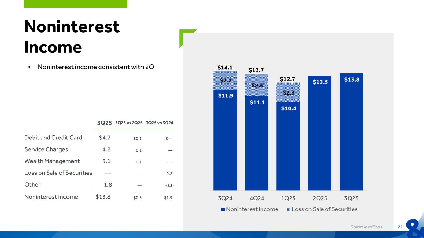 20 Net Interest Income $84.5 $83.3 $83.3 $86.6 $89.2 3.82% 3.77% 3.81% 3.88% 3.93% 3.23% 3.26% 3.38% 3.48% 3.54% NII NIM (FTE)* Peer 3Q24 4Q24 1Q25 2Q25 3Q25 Total Cost of Funds 0.07% (0.11)% (0.12)% (0.03)% 2.31% 2.20% 2.08% 2.08% 2.05% Changes in Cost of Funds Cost of Funds 3Q24 4Q24 1Q25 2Q25 3Q25 • Net interest income growth of $2.6 million, or 3.00%, compared to 2Q25 • NIM (FTE)* expansion of 5 basis points to 3.93% • Total cost of funds down 3 basis points to 2.05% • Average DDA increased $50.0 million compared to 2Q25 0.00% Dollars in millions *Non-GAAP financial measure. Refer to appendix for reconciliation of non-GAAP financial measures
