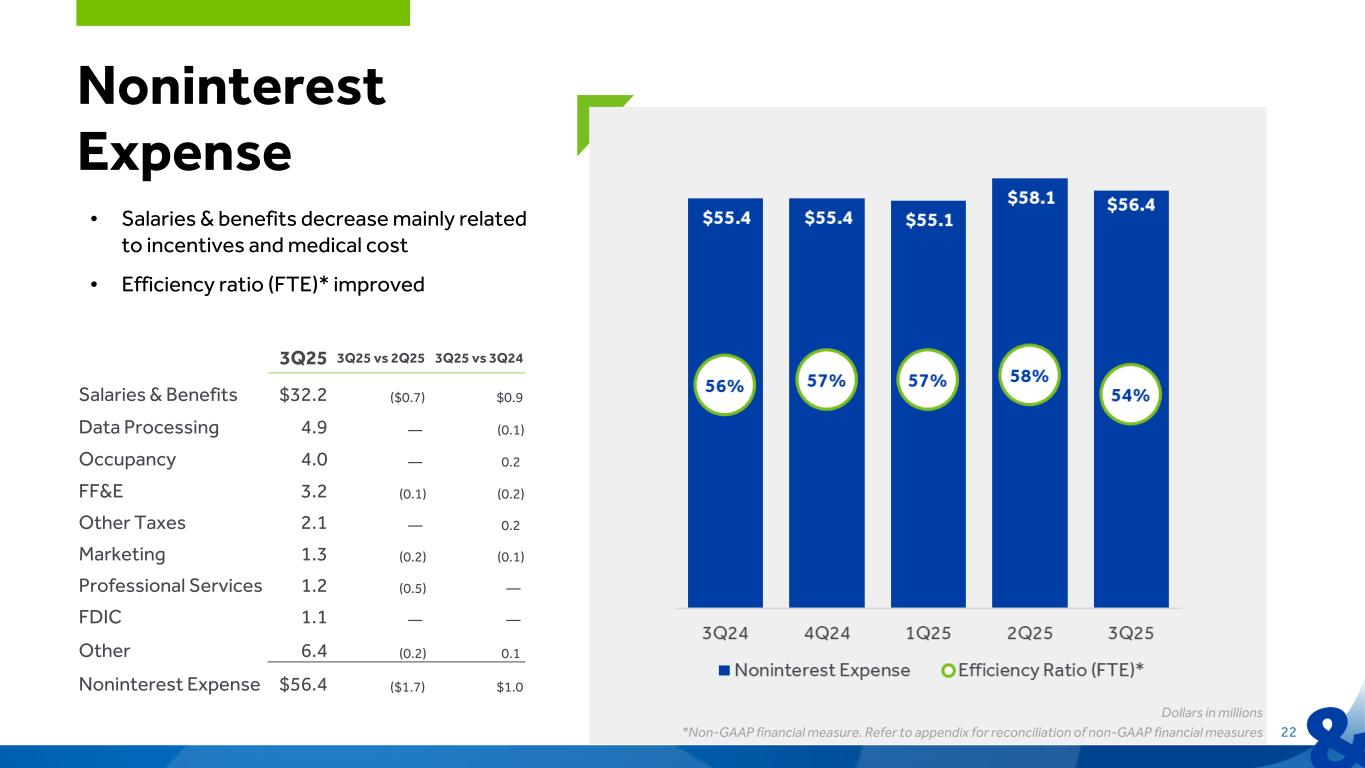 21 Noninterest Income Dollars in millions 3Q25 3Q25 vs 2Q25 3Q25 vs 3Q24 Debit and Credit Card $4.7 $0.1 $— Service Charges 4.2 0.1 — Wealth Management 3.1 0.1 — Loss on Sale of Securities — — 2.2 Other 1.8 — (0.3) Noninterest Income $13.8 $0.3 $1.9 • Noninterest income consistent with 2Q $14.1 $13.7 $12.7