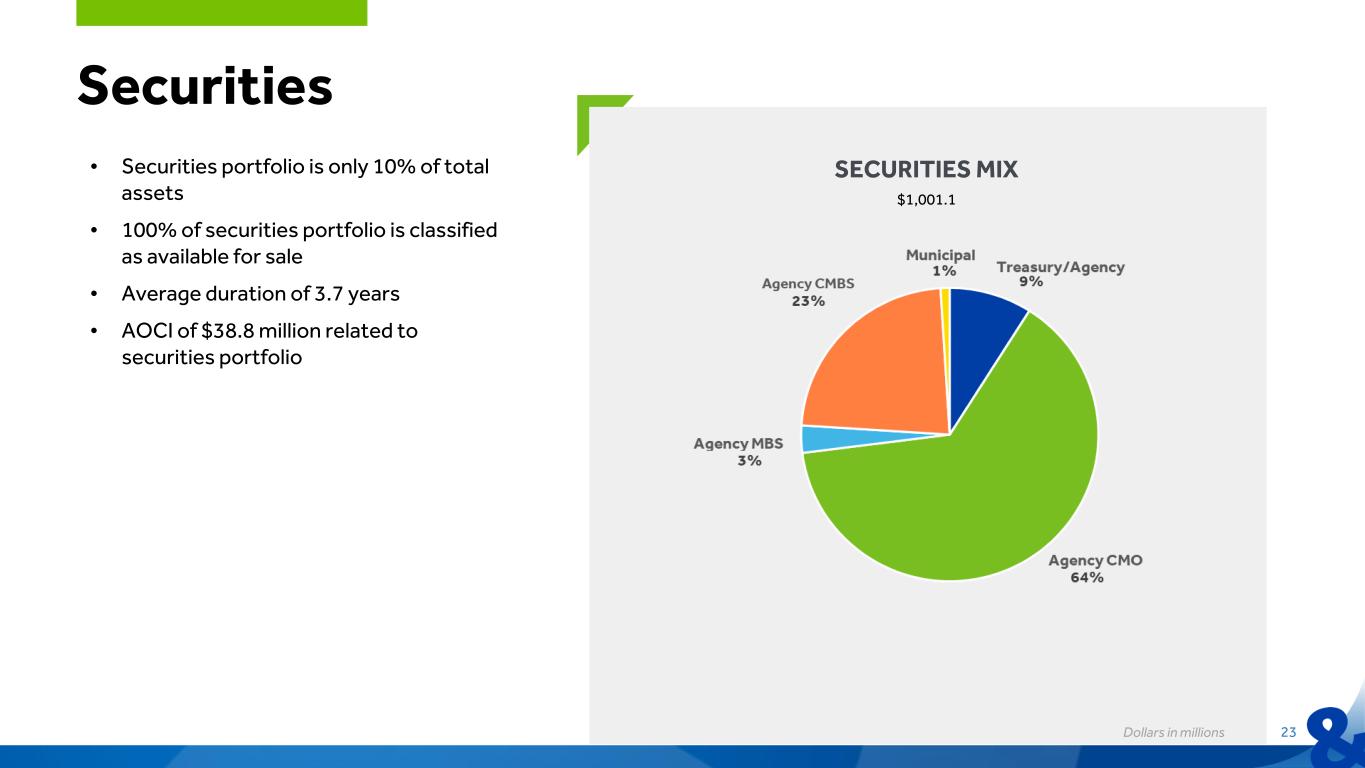 22 3Q25 3Q25 vs 2Q25 3Q25 vs 3Q24 Salaries & Benefits $32.2 ($0.7) $0.9 Data Processing 4.9 — (0.1) Occupancy 4.0 — 0.2 FF&E 3.2 (0.1) (0.2) Other Taxes 2.1 — 0.2 Marketing 1.3 (0.2) (0.1) Professional Services 1.2 (0.5) — FDIC 1.1 — — Other 6.4 (0.2) 0.1 Noninterest Expense $56.4 ($1.7) $1.0 Noninterest Expense • Salaries & benefits decrease mainly related to incentives and medical cost • Efficiency ratio (FTE)* improved Dollars in millions *Non-GAAP financial measure. Refer to appendix for reconciliation of non-GAAP financial measures