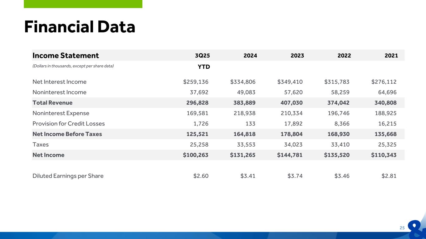 Income Statement 3Q25 2024 2023 2022 2021 (Dollars in thousands, except per share data) YTD Net Interest Income $259,136 $334,806 $349,410 $315,783 $276,112 Noninterest Income 37,692 49,083 57,620 58,259 64,696 Total Revenue 296,828 383,889 407,030 374,042 340,808 Noninterest Expense 169,581 218,938 210,334 196,746 188,925 Provision for Credit Losses 1,726 133 17,892 8,366 16,215 Net Income Before Taxes 125,521 164,818 178,804 168,930 135,668 Taxes 25,258 33,553 34,023 33,410 25,325 Net Income $100,263 $131,265 $144,781 $135,520 $110,343 Diluted Earnings per Share $2.60 $3.41 $3.74 $3.46 $2.81 Financial Data 25
