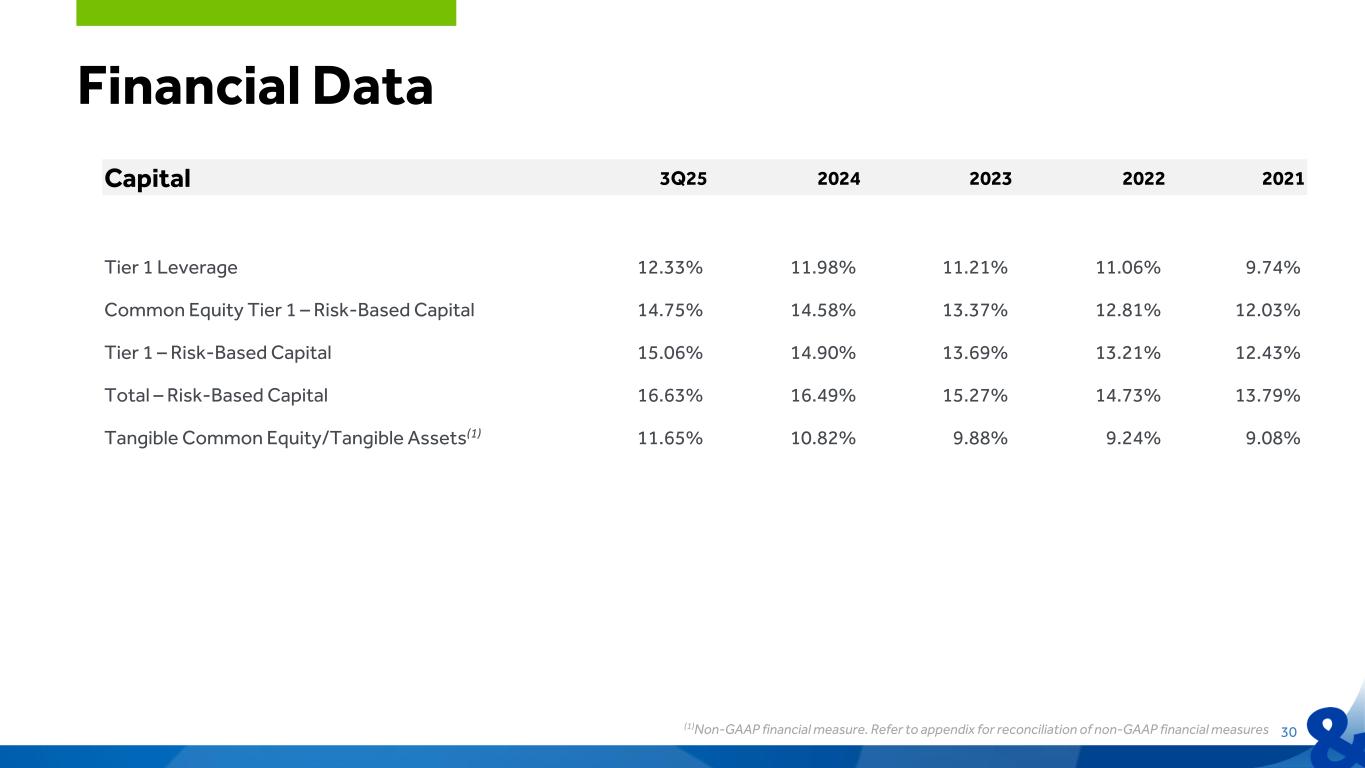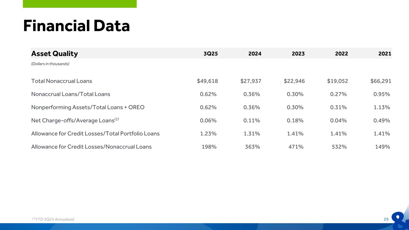 Asset Quality 3Q25 2024 2023 2022 2021 (Dollars in thousands) Total Nonaccrual Loans $49,618 $27,937 $22,946 $19,052 $66,291 Nonaccrual Loans/Total Loans 0.62% 0.36% 0.30% 0.27% 0.95% Nonperforming Assets/Total Loans + OREO 0.62% 0.36% 0.30% 0.31% 1.13% Net Charge-offs/Average Loans(1) 0.06% 0.11% 0.18% 0.04% 0.49% Allowance for Credit Losses/Total Portfolio Loans 1.23% 1.31% 1.41% 1.41% 1.41% Allowance for Credit Losses/Nonaccrual Loans 198% 363% 471% 532% 149% Financial Data 29(1)YTD 3Q25 Annualized