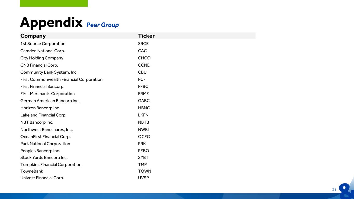 Appendix Peer Group 31 Company Ticker 1st Source Corporation SRCE Camden National Corp. CAC City Holding Company CHCO CNB Financial Corp. CCNE Community Bank System, Inc. CBU First Commonwealth Financial Corporation FCF First Financial Bancorp. FFBC First Merchants Corporation FRME German American Bancorp Inc. GABC Horizon Bancorp Inc. HBNC Lakeland Financial Corp. LKFN NBT Bancorp Inc. NBTB Northwest Bancshares, Inc. NWBI OceanFirst Financial Corp. OCFC Park National Corporation PRK Peoples Bancorp Inc. PEBO Stock Yards Bancorp Inc. SYBT Tompkins Financial Corporation TMP TowneBank TOWN Univest Financial Corp. UVSP