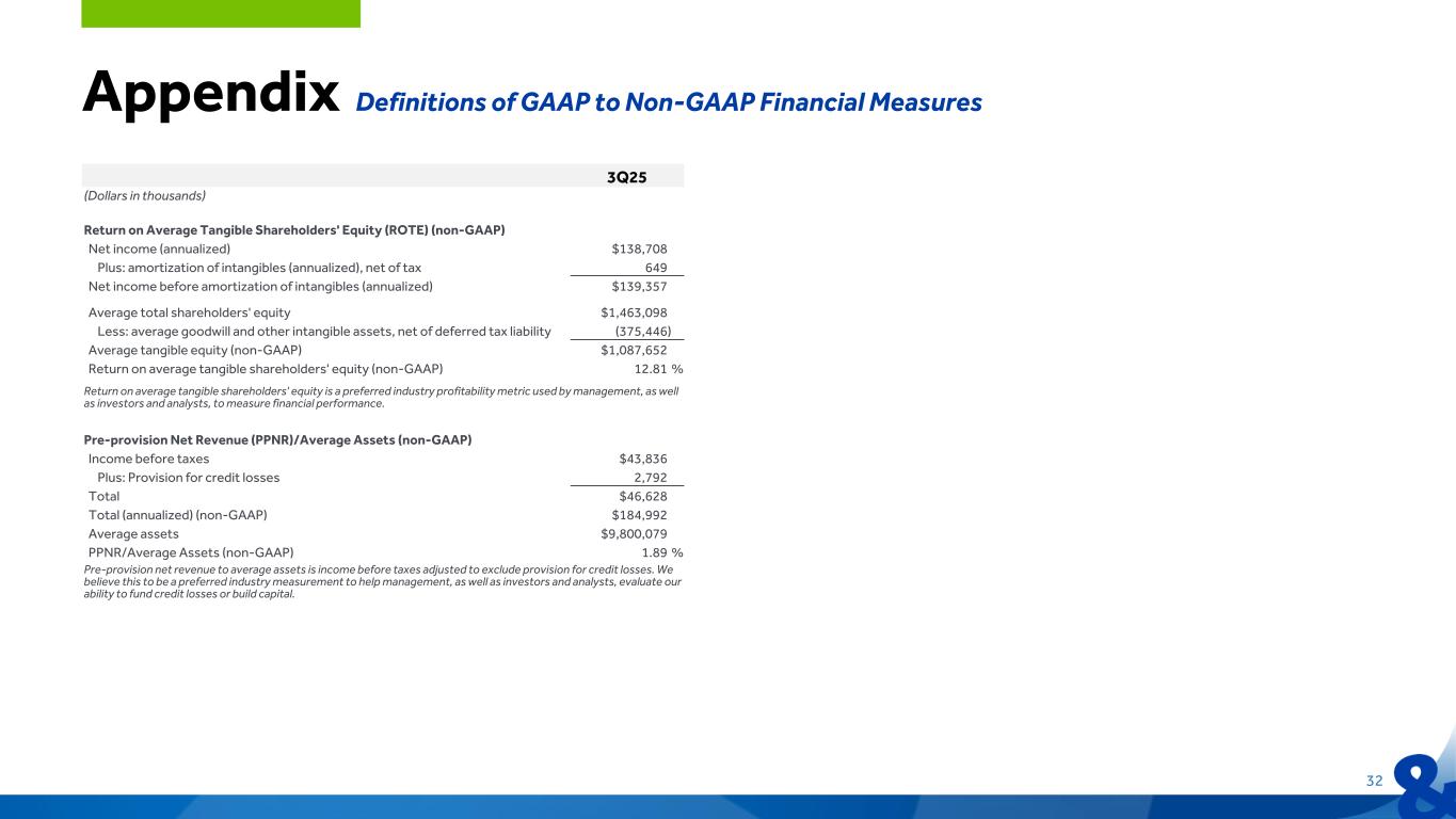 3Q25 (Dollars in thousands) Return on Average Tangible Shareholders' Equity (ROTE) (non-GAAP) Net income (annualized) $138,708 Plus: amortization of intangibles (annualized), net of tax 649 Net income before amortization of intangibles (annualized) $139,357 Average total shareholders' equity $1,463,098 Less: average goodwill and other intangible assets, net of deferred tax liability (375,446) Average tangible equity (non-GAAP) $1,087,652 Return on average tangible shareholders' equity (non-GAAP) 12.81 % Return on average tangible shareholders' equity is a preferred industry profitability metric used by management, as well as investors and analysts, to measure financial performance. Pre-provision Net Revenue (PPNR)/Average Assets (non-GAAP) Income before taxes $43,836 Plus: Provision for credit losses 2,792 Total $46,628 Total (annualized) (non-GAAP) $184,992 Average assets $9,800,079 PPNR/Average Assets (non-GAAP) 1.89 % Pre-provision net revenue to average assets is income before taxes adjusted to exclude provision for credit losses. We believe this to be a preferred industry measurement to help management, as well as investors and analysts, evaluate our ability to fund credit losses or build capital. Appendix Definitions of GAAP to Non-GAAP Financial Measures 32