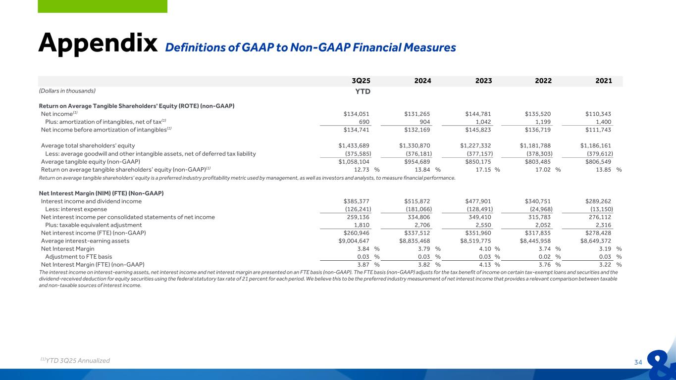 3Q25 2Q25 1Q25 4Q24 3Q24 (Dollars in thousands) Tangible Common Equity (TCE)/Tangible Assets (non-GAAP) Total shareholders' equity $1,475,466 $1,445,493 $1,418,034 $1,380,294 $1,375,754 Less: goodwill and other intangible assets, net of deferred tax liability (375,359) (375,522) (375,646) (375,837) (375,931) Tangible common equity (non-GAAP) $1,100,107 $1,069,971 $1,042,388 $1,004,457 $999,823 Total assets $9,817,483 $9,810,069 $9,718,276 $9,657,972 $9,583,947 Less: goodwill and other intangible assets, net of deferred tax liability (375,359) (375,522) (375,646) (375,837) (375,931) Tangible assets (non-GAAP) $9,442,124 $9,434,547 $9,342,630 $9,282,135 $9,208,016 Tangible common equity to tangible assets (non-GAAP) 11.65 % 11.34 % 11.16 % 10.82 % 10.86 % Tangible common equity to tangible assets is a preferred industry measurement to evaluate capital adequacy. Efficiency Ratio (FTE) (non-GAAP) Noninterest expense $56,376 $58,114 $55,091 $55,445 $55,365 Net interest income $89,241 $86,572 $83,323 $83,258 $84,477 Plus: taxable equivalent adjustment 602 590 617 660 671 Net interest income (FTE) (non-GAAP) 89,843 87,162 83,940 83,918 85,148 Noninterest income 13,763 13,500 10,429 11,071 11,877 Plus: net loss on sale of securities — — 2,295 2,592 2,199 Less: gain on Visa Class B-1 exchange — — — (186) (150) Net interest income (FTE) (non-GAAP) plus noninterest income $103,606 $100,662 $96,664 $97,395 $99,074 Efficiency ratio (FTE) (non-GAAP) 54.41 % 57.73 % 56.99 % 56.93 % 55.88 % The efficiency ratio is noninterest expense divided by noninterest income plus net interest income, on an FTE basis (non-GAAP), adjusted to exclude losses on sale of securities and gain on Visa exchange. We believe the FTE basis ensures comparability of net interest income arising from both taxable and tax-exempt sources and is consistent with industry practice. Net Interest Margin (NIM) (FTE) (non-GAAP) Interest income and dividend income $131,623 $128,906 $124,848 $127,879 $131,474 Less: interest expense (42,382) (42,334) (41,525) (44,621) (46,997) Net interest income 89,241 86,572 83,323 83,258 84,477 Plus: taxable equivalent adjustment 602 590 617 660 671 Net interest income (FTE) (non-GAAP) $89,843 $87,162 $83,940 $83,918 $85,148 Net interest income (FTE) (annualized) $356,442 $349,606 $340,423 $333,848 $338,741 Average interest-earning assets $9,100,239 $9,012,011 $8,899,485 $8,860,338 $8,875,757 Net interest margin (FTE) (non-GAAP) 3.93 % 3.88 % 3.81 % 3.77 % 3.82 % The interest income on interest-earning assets, net interest income and net interest margin are presented on an FTE basis (non-GAAP). The FTE basis (non-GAAP) adjusts for the tax benefit of income on certain tax-exempt loans and securities and the dividend-received deduction for equity securities using the federal statutory tax rate of 21 percent for each period. We believe this to be the preferred industry measurement of net interest income that provides a relevant comparison between taxable and non-taxable sources of interest income. Appendix Definitions of GAAP to Non-GAAP Financial Measures 33