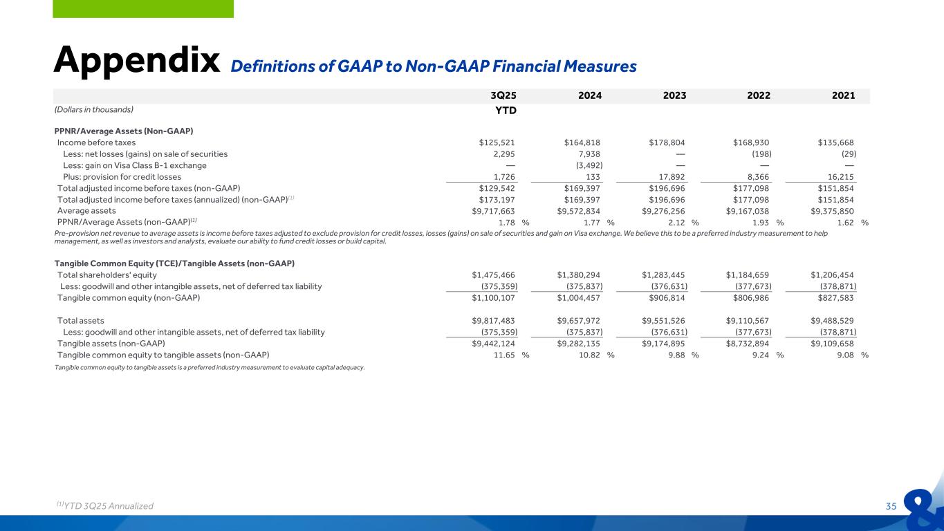 3Q25 2024 2023 2022 2021 (Dollars in thousands) YTD Return on Average Tangible Shareholders' Equity (ROTE) (non-GAAP) Net income(1) $134,051 $131,265 $144,781 $135,520 $110,343 Plus: amortization of intangibles, net of tax(1) 690 904 1,042 1,199 1,400 Net income before amortization of intangibles(1) $134,741 $132,169 $145,823 $136,719 $111,743 Average total shareholders' equity $1,433,689 $1,330,870 $1,227,332 $1,181,788 $1,186,161 Less: average goodwill and other intangible assets, net of deferred tax liability (375,585) (376,181) (377,157) (378,303) (379,612) Average tangible equity (non-GAAP) $1,058,104 $954,689 $850,175 $803,485 $806,549 Return on average tangible shareholders’ equity (non-GAAP)(1) 12.73 % 13.84 % 17.15 % 17.02 % 13.85 % Return on average tangible shareholders' equity is a preferred industry profitability metric used by management, as well as investors and analysts, to measure financial performance. Net Interest Margin (NIM) (FTE) (Non-GAAP) Interest income and dividend income $385,377 $515,872 $477,901 $340,751 $289,262 Less: interest expense (126,241) (181,066) (128,491) (24,968) (13,150) Net interest income per consolidated statements of net income 259,136 334,806 349,410 315,783 276,112 Plus: taxable equivalent adjustment 1,810 2,706 2,550 2,052 2,316 Net interest income (FTE) (non-GAAP) $260,946 $337,512 $351,960 $317,835 $278,428 Average interest-earning assets $9,004,647 $8,835,468 $8,519,775 $8,445,958 $8,649,372 Net Interest Margin 3.84 % 3.79 % 4.10 % 3.74 % 3.19 % Adjustment to FTE basis 0.03 % 0.03 % 0.03 % 0.02 % 0.03 % Net Interest Margin (FTE) (non-GAAP) 3.87 % 3.82 % 4.13 % 3.76 % 3.22 % The interest income on interest-earning assets, net interest income and net interest margin are presented on an FTE basis (non-GAAP). The FTE basis (non-GAAP) adjusts for the tax benefit of income on certain tax-exempt loans and securities and the dividend-received deduction for equity securities using the federal statutory tax rate of 21 percent for each period. We believe this to be the preferred industry measurement of net interest income that provides a relevant comparison between taxable and non-taxable sources of interest income. Appendix Definitions of GAAP to Non-GAAP Financial Measures 34(1)YTD 3Q25 Annualized