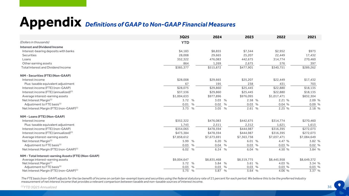 3Q25 2024 2023 2022 2021 (Dollars in thousands) YTD Interest and Dividend Income Interest-bearing deposits with banks $4,183 $8,855 $7,344 $2,952 $973 Securities 28,008 29,665 25,207 22,449 17,432 Loans 352,322 476,083 442,675 314,774 270,460 Other earning assets 864 1,269 2,675 576 397 Total Interest and Dividend Income $385,377 $515,872 $477,901 $340,751 $289,262 NIM - Securities (FTE) (Non-GAAP) Interest income $28,008 $29,665 $25,207 $22,449 $17,432 Plus: taxable equivalent adjustment 67 195 238 431 703 Interest income (FTE) (non-GAAP) $28,075 $29,860 $25,445 $22,880 $18,135 Interest income (FTE) (annualized)(1) $37,536 $29,860 $25,445 $22,880 $18,135 Average interest-earning assets $1,004,633 $977,896 $976,095 $1,017,471 $832,304 Net Interest Margin(1) 3.72 % 3.03 % 2.58 % 2.21 % 2.09 % Adjustment to FTE basis(1) 0.01 % 0.02 % 0.03 % 0.04 % 0.09 % Net Interest Margin (FTE) (non-GAAP)(1) 3.73 % 3.05 % 2.61 % 2.25 % 2.18 % NIM - Loans (FTE) (Non-GAAP) Interest income $352,322 $476,083 $442,675 $314,774 $270,460 Plus: taxable equivalent adjustment 1,743 2,511 2,312 1,621 1,613 Interest income (FTE) (non-GAAP) $354,065 $478,594 $444,987 $316,395 $272,073 Interest income (FTE) (annualized)(1) $473,384 $478,594 $444,987 $316,395 $272,073 Average interest-earning assets $7,858,612 $7,673,691 $7,363,738 $7,037,471 $7,084,649 Net Interest Margin(1) 5.99 % 6.20 % 6.01 % 4.47 % 3.82 % Adjustment to FTE basis(1) 0.03 % 0.04 % 0.03 % 0.03 % 0.02 % Net Interest Margin (FTE) (non-GAAP)(1) 6.02 % 6.24 % 6.04 % 4.50 % 3.84 % NIM - Total Interest-earning Assets (FTE) (Non-GAAP) Average interest-earning assets $9,004,647 $8,835,468 $8,519,775 $8,445,958 $8,649,372 Net Interest Margin(1) 5.72 % 5.84 % 5.61 % 4.03 % 3.34 % Adjustment to FTE basis(1) 0.03 % 0.03 % 0.03 % 0.03 % 0.03 % Net Interest Margin (FTE) (non-GAAP)(1) 5.75 % 5.87 % 5.64 % 4.06 % 3.37 % The FTE basis (non-GAAP) adjusts for the tax benefit of income on certain tax-exempt loans and securities using the federal statutory rate of 21 percent for each period. We believe this to be the preferred industry measurement of net interest income that provides a relevant comparison between taxable and non-taxable sources of interest income. Appendix Definitions of GAAP to Non-GAAP Financial Measures 36(1)YTD 3Q25 Annualized