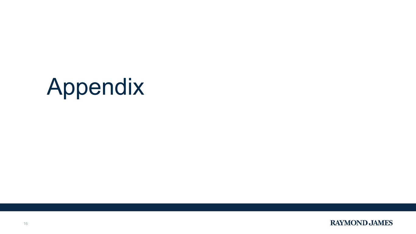 Other financial information 14 *This amount includes cash and cash equivalents on hand at the parent, as well as parent cash loaned to RJ&A, which RJ&A has invested on behalf of RJF in cash and cash equivalents or otherwise deployed in its normal business activities. **This is a non-GAAP measure. See the schedules in the Appendix of this presentation for a reconciliation of our non-GAAP measures to the most directly comparable GAAP measures and for more information on these measures. ***Estimated. $ in billions except per share amounts 4Q25 vs. 4Q24 vs. 3Q25 Total assets $ 88.2 6% 4% RJF corporate cash* $ 3.7 71% 58% Total common equity attributable to RJF $ 12.4 7% 2% Book value per share $ 62.72 10% 3% Tangible book value per share** $ 54.12 12% 3% Weighted-average common and common equivalent shares outstanding — diluted (shares in millions) 203.8 (3)% (1)% 4Q24 3Q25 Tier 1 leverage ratio*** 13.1 % 12.8% 13.1% Tier 1 capital ratio*** 23.0 % 22.8% 22.9% Common equity tier 1 ratio*** 22.9 % 22.6% 22.7% Total capital ratio*** 24.1 % 24.1% 24.2% Effective tax rate 17.4 % 20.8% 22.6%