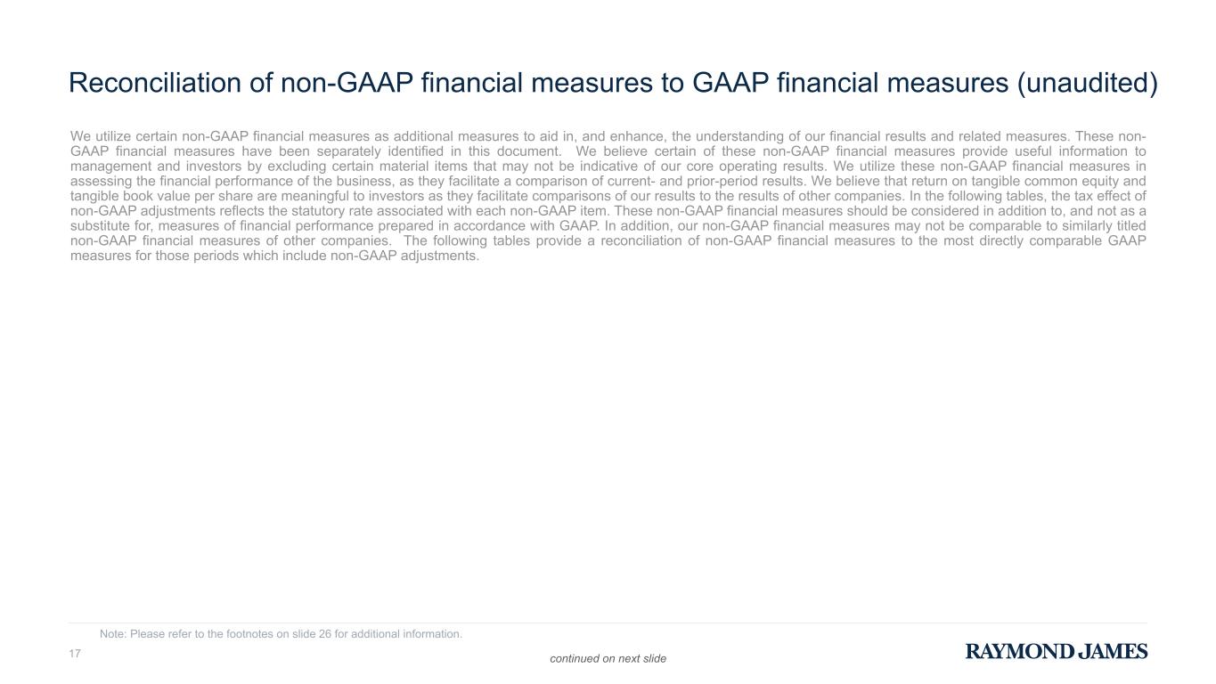 Reconciliation of non-GAAP financial measures to GAAP financial measures (unaudited) 23 Note: Please refer to the footnotes on slide 26 for additional information. Book value per share As of $ in millions, except per share amounts September 30, 2024 June 30, 2025 September 30, 2025 Total common equity attributable to Raymond James Financial, Inc. $ 11,594 $ 12,180 $ 12,424 Less non-GAAP adjustments: Goodwill and identifiable intangible assets, net 1,886 1,860 1,847 Deferred tax liabilities related to goodwill and identifiable intangible assets, net (138) (143) (144) Tangible common equity attributable to Raymond James Financial, Inc. $ 9,846 $ 10,463 $ 10,721 Common shares outstanding 203.3 200.0 198.1 Book value per share (6) $ 57.03 $ 60.90 $ 62.72 Tangible book value per share (6) $ 48.43 $ 52.32 $ 54.12 continued on next slide