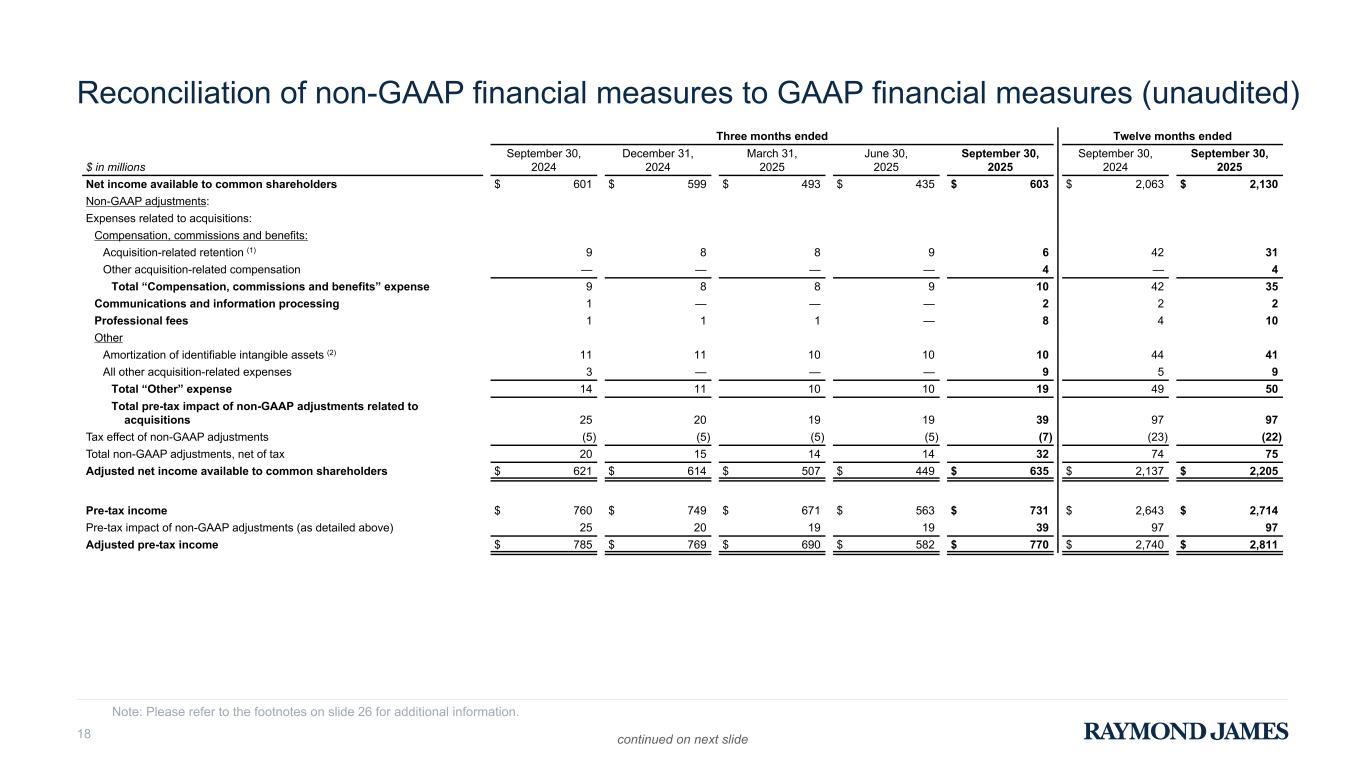 Footnotes 26 (1) Includes acquisition-related compensation expenses primarily arising from equity and cash-based retention awards issued in conjunction with acquisitions in prior years. Such retention awards are generally contingent upon the post-closing continuation of service of certain associates who joined the firm as part of such acquisitions and are expensed over the requisite service period. (2) Amortization of identifiable intangible assets, which was included in “Other” expense, includes amortization of identifiable intangible assets arising from our acquisitions. (3) Pre-tax margin is computed by dividing pre-tax income by net revenues for each respective period or, in the case of adjusted pre-tax margin, computed by dividing adjusted pre-tax income by net revenues for each respective period. (4) Total compensation ratio is computed by dividing compensation, commissions and benefits expense by net revenues for each respective period or, in the case of adjusted total compensation ratio, computed by dividing adjusted compensation, commissions and benefits expense by net revenues for each respective period. (5) Earnings per common share is computed by dividing net income available to common shareholders (less allocation of earnings and dividends to participating securities) by weighted-average common shares outstanding (basic or diluted as applicable) for each respective period or, in the case of adjusted earnings per common share, computed by dividing adjusted net income available to common shareholders (less allocation of earnings and dividends to participating securities) by weighted-average common shares outstanding (basic or diluted as applicable) for each respective period. The allocations of earnings and dividends to participating securities were $1 million for each of the three months ended September 30, 2025 and September 30, 2024 and an insignificant amount for the three months ended June 30, 2025. The allocations of earnings and dividends to participating securities were $3 million and $4 million for the twelve months ended September 30, 2025 and 2024, respectively. (6) Book value per share is computed by dividing total common equity attributable to Raymond James Financial, Inc. by the number of common shares outstanding at the end of each respective period or, in the case of tangible book value per share, computed by dividing tangible common equity by the number of common shares outstanding at the end of each respective period. (7) Average common equity for the quarter-to-date period is computed by adding the total common equity attributable to Raymond James Financial, Inc. as of the date indicated to the prior quarter-end total, and dividing by two, or in the case of average tangible common equity, computed by adding tangible common equity as of the date indicated to the prior quarter-end total, and dividing by two. For the year-to-date period, average common equity is computed by adding the total common equity attributable to Raymond James Financial, Inc. as of each quarter-end date during the indicated period to the beginning of year total, and dividing by five, or in the case of average tangible common equity, computed by adding tangible common equity as of each quarter-end date during the indicated period to the beginning of year total, and dividing by five. Adjusted average common equity is computed by adjusting for the impact on average common equity of the non-GAAP adjustments, as applicable for each respective period. Adjusted average tangible common equity is computed by adjusting for the impact on average tangible common equity of the non-GAAP adjustments, as applicable for each respective period. (8) Return on common equity is computed by dividing annualized net income available to common shareholders by average common equity for each respective period or, in the case of return on tangible common equity, computed by dividing annualized net income available to common shareholders by average tangible common equity for each respective period. Adjusted return on common equity is computed by dividing annualized adjusted net income available to common shareholders by adjusted average common equity for each respective period, or in the case of adjusted return on tangible common equity, computed by dividing annualized adjusted net income available to common shareholders by adjusted average tangible common equity for each respective period. Tangible common equity is defined as total common equity attributable to Raymond James Financial, Inc. less goodwill and identifiable intangible assets, net of related deferred taxes.